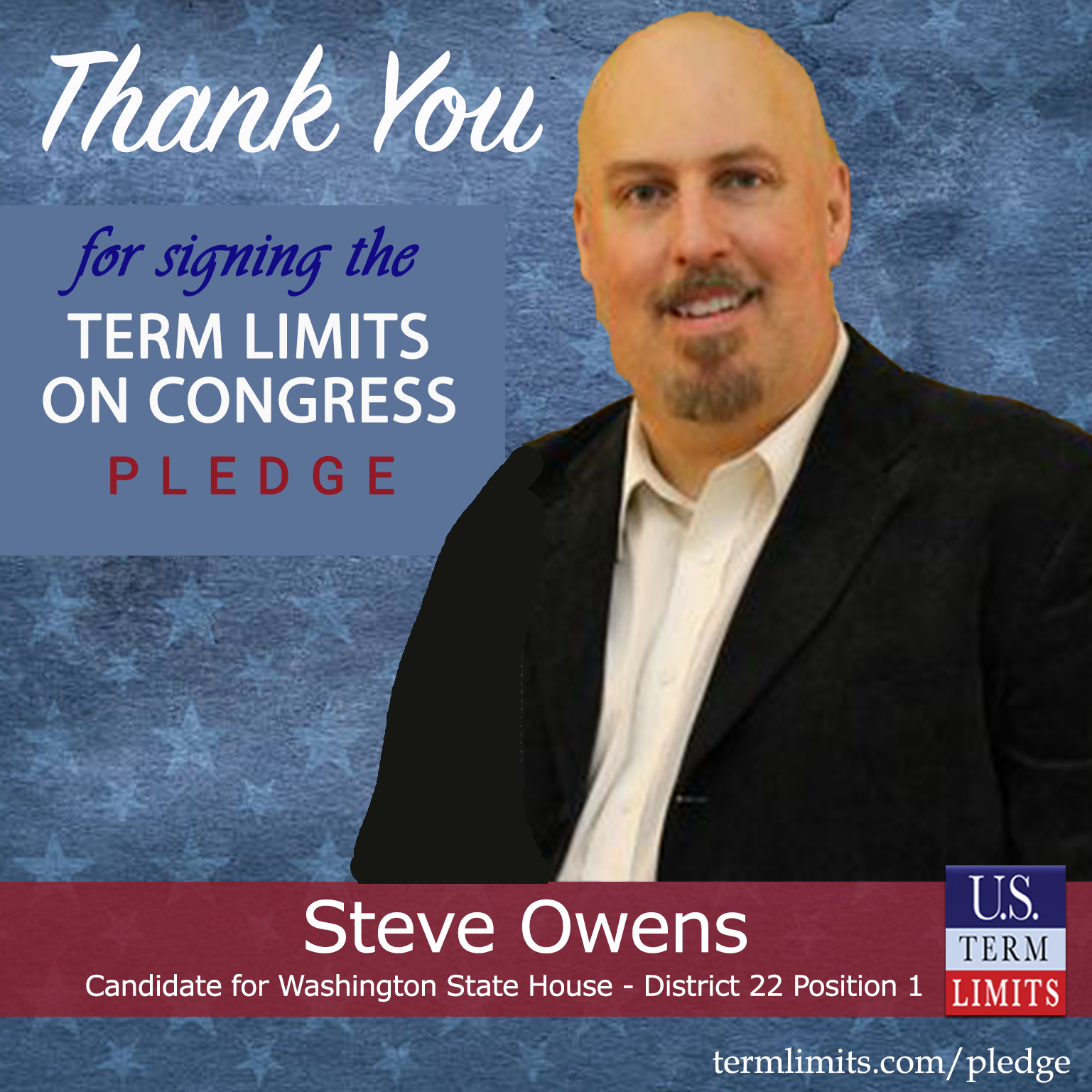 Olympia, WA – U.S. Term Limits (USTL), the leader in the national, non-partisan movement to limit terms for elected officials, is gathering support from state lawmakers across the nation. Its mission is to get 34 states to apply for an amendment proposal convention specific to term limits on Congress. Washington state house candidate, Steve Owens (District 22 – Position 1), has committed support for term limits on Congress by signing the Term Limits Convention Pledge.
