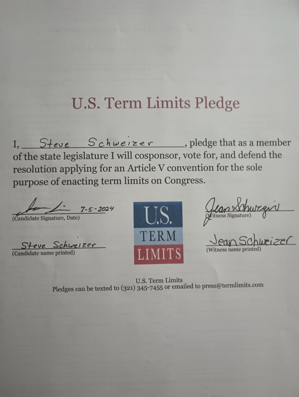 Steve Schweizer Pledges to Support Congressional Term Limits