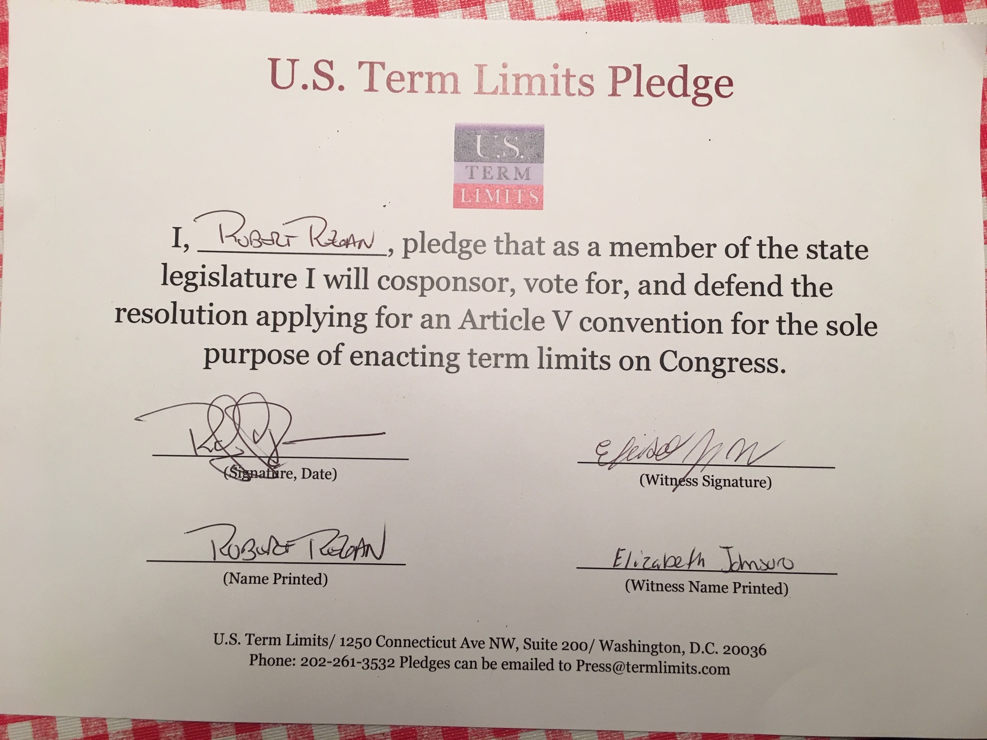 The U.S. Term Limits pledge is provided to candidates and members of state legislatures. It reads, “I pledge that, as a member of the state legislature, I will cosponsor, vote for, and defend the resolution applying for an Article V convention for the limited purpose of enacting term limits on Congress.”
