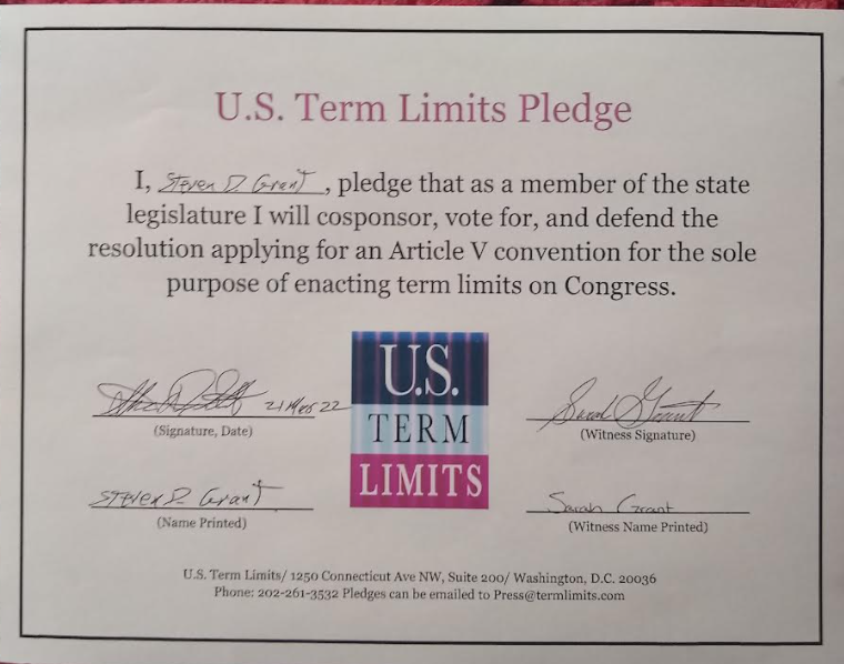 USTL President, Philip Blumel, commented on Grant’s pledge saying, “Steven’s support of term limits shows that there are individuals who are willing to listen to the majority of voters who want term limits. America needs a Congress that will be served by citizen legislators, not career politicians.”