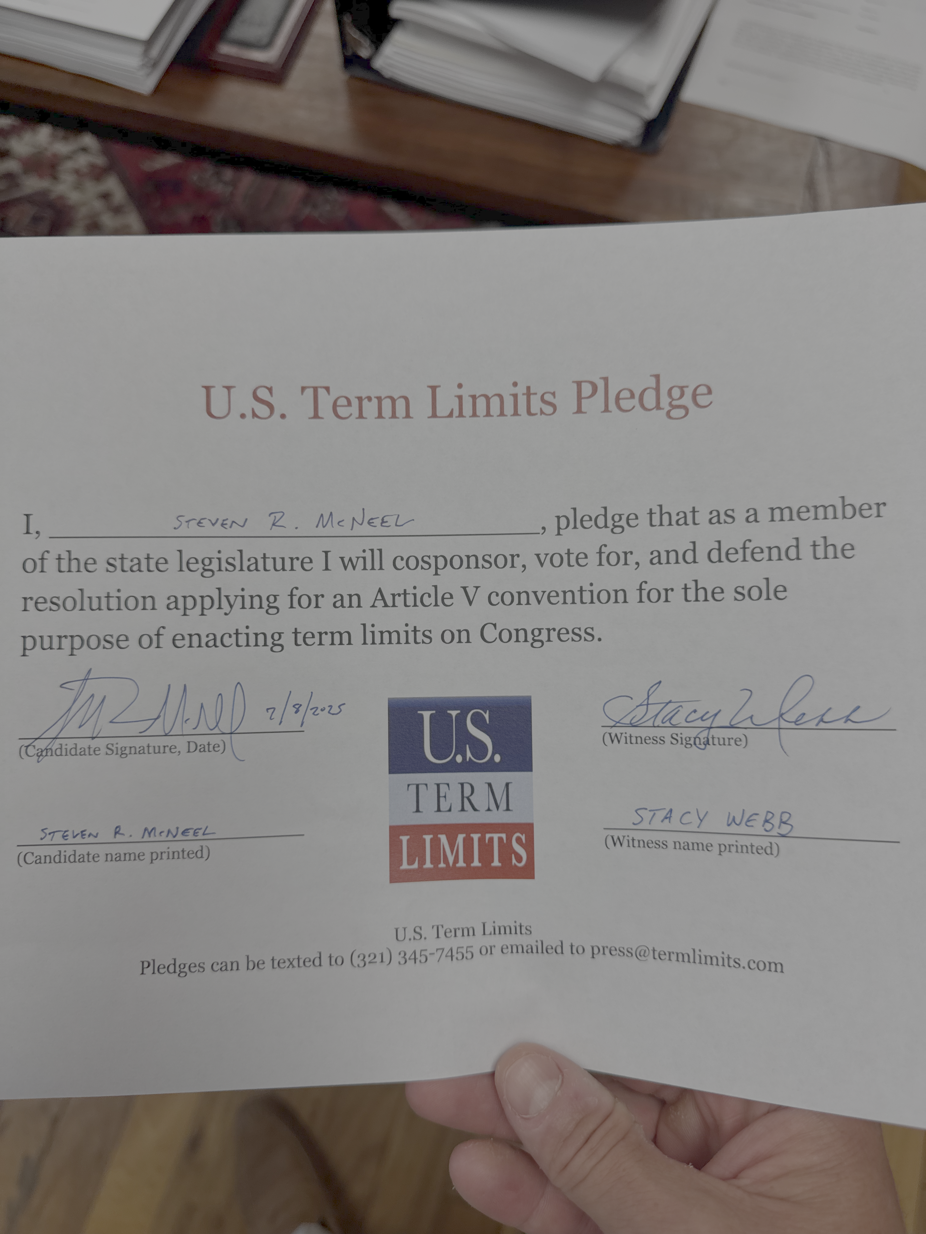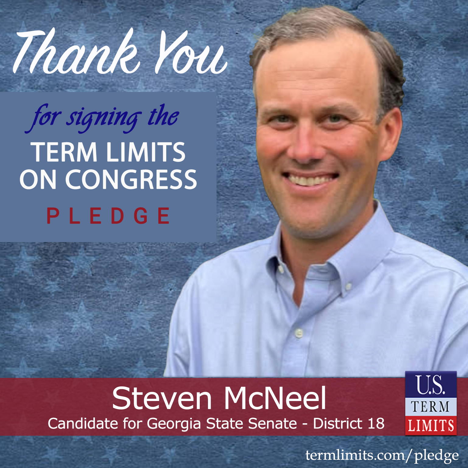 Roberta, GA – U.S. Term Limits (USTL), the leader in the national, non-partisan movement to limit terms for elected officials, is gathering support from state lawmakers across the nation. Its mission is to get 34 states to apply for an amendment proposal convention specific to term limits on Congress. 2026 Georgia state senate candidate, Steven McNeel (district 18), has committed support for term limits on Congress by signing the term limits convention pledge. Candidate Lauren McDaniel, also signed the pledge.