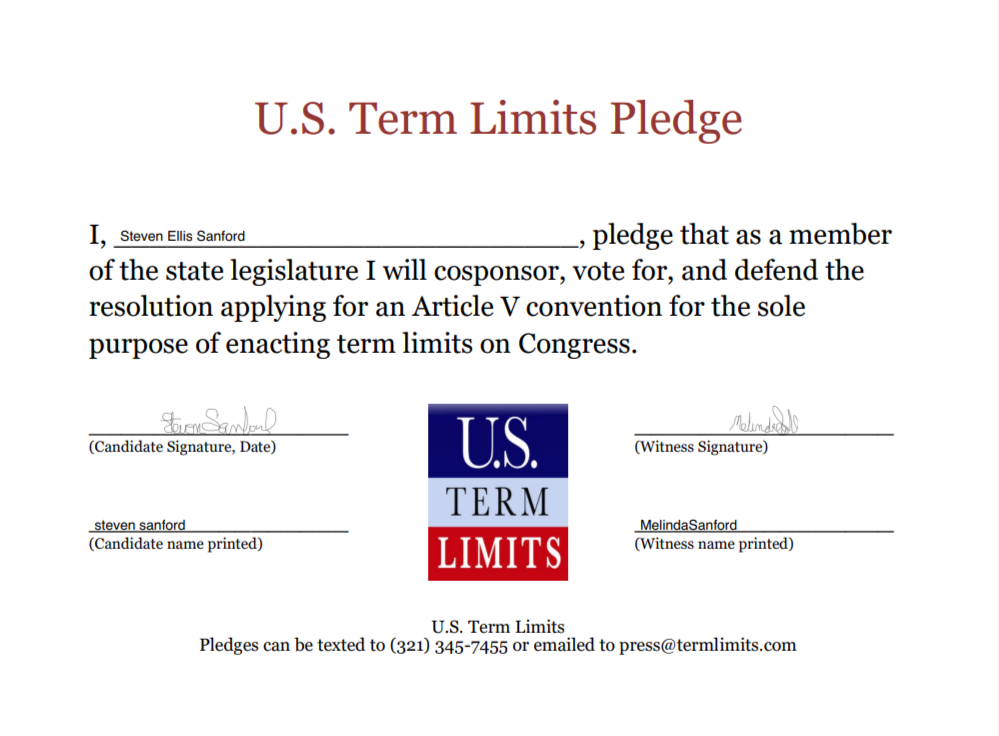 The U.S. Term Limits pledge is provided to candidates and members of state legislatures. It reads, “I pledge that, as a member of the state legislature, I will cosponsor, vote for, and defend the resolution applying for an Article V convention for the sole purpose of enacting term limits on Congress.”
