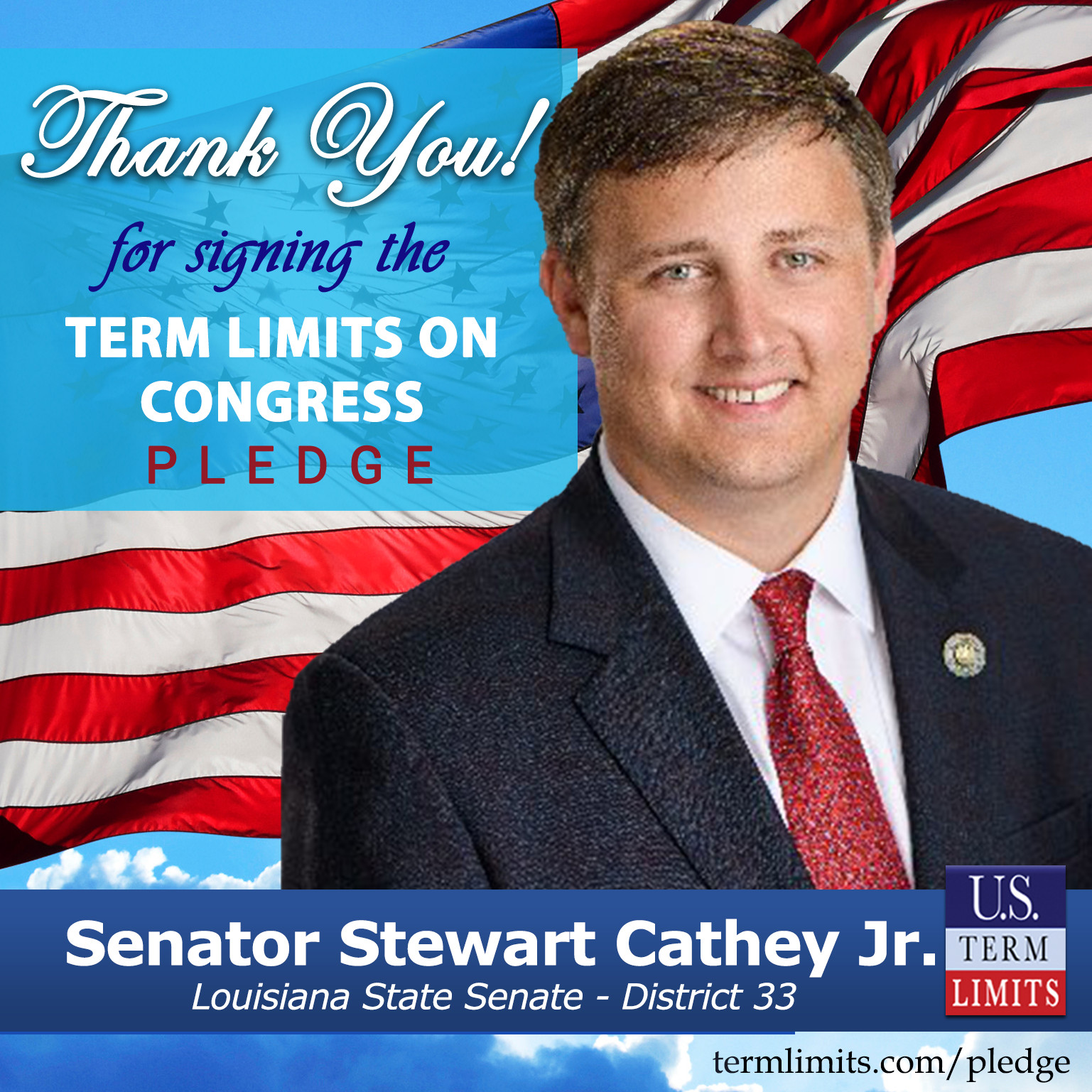 Farmerville, LA – U.S. Term Limits (USTL), the leader in the national, non-partisan movement to limit terms for elected officials, is gathering support from state lawmakers across the nation. Its mission is to get 34 states to apply for an amendment proposal convention specific to term limits on Congress. Louisiana state senate candidate, Senator Stewart Cathey Jr. (District 33), has committed support for term limits on Congress by signing the Term Limits Convention pledge. Previously, candidate Ned White also signed the pledge in this race.