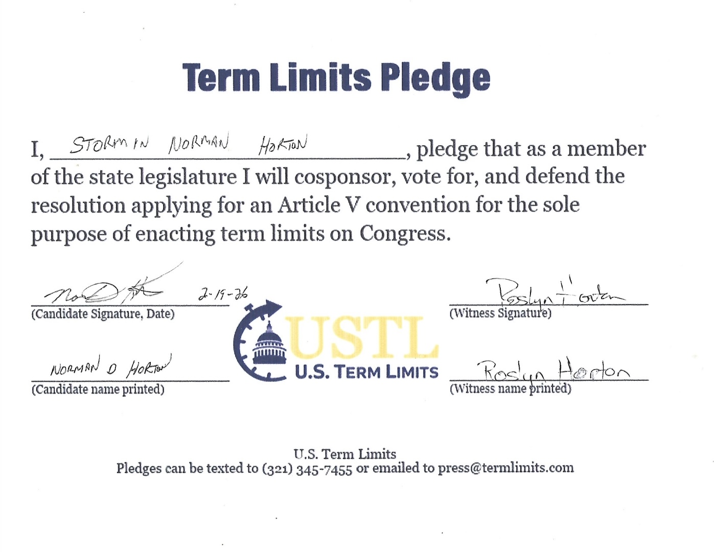 Ozark, AL – U.S. Term Limits (USTL), the leader in the national, non-partisan movement to limit terms for elected officials, is gathering support from state lawmakers across the nation. Its mission is to get 34 states to apply for an amendment proposal convention specific to term limits on Congress. 2026 Alabama state house candidate, Stormin’ Norman Horton (district 93), has committed support for term limits on Congress by signing the term limits convention pledge.