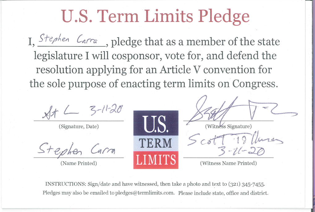 The U.S. Term Limits pledge is provided to candidates and members of state legislatures. It reads, “I pledge that, as a member of the state legislature, I will cosponsor, vote for, and defend the resolution applying for an Article V convention for the limited purpose of enacting term limits on Congress.”