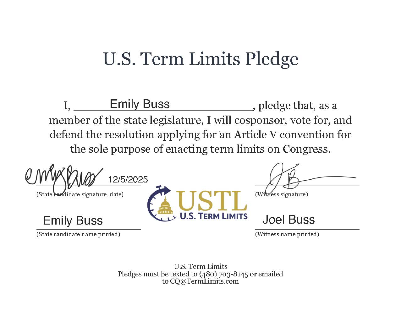 West Valley City, UT – U.S. Term Limits (USTL), the leader in the national, non-partisan movement to limit terms for elected officials, is gathering support from state lawmakers across the nation. Its mission is to get 34 states to apply for an amendment proposal convention specific to term limits on Congress. Utah state senate candidate, Emily Buss (District 11), has committed support for term limits on Congress by signing the term limits convention pledge. Previously, candidates Tynley Bean and Maleah Bliss also signed the pledge.