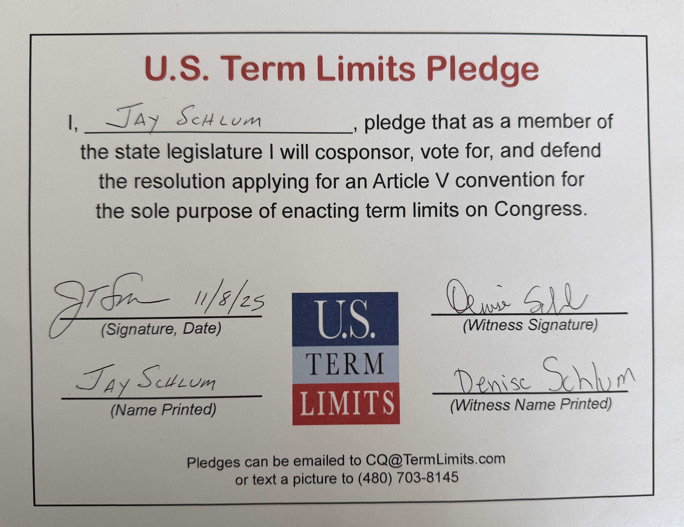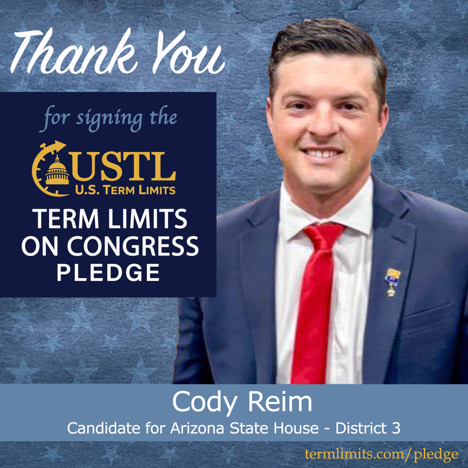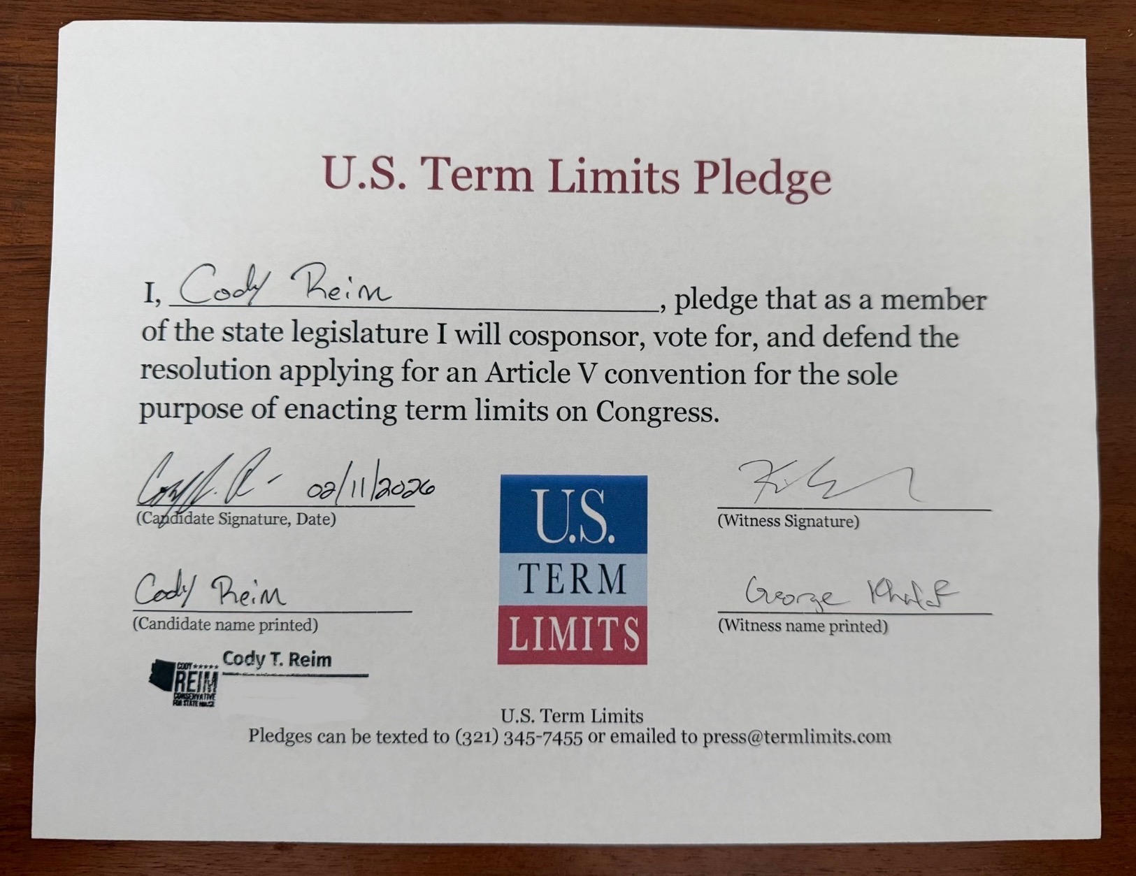 Fountain Hills, AZ – U.S. Term Limits (USTL), the leader in the national, non-partisan movement to limit terms for elected officials, is gathering support from state lawmakers across the nation. Its mission is to get 34 states to apply for an amendment proposal convention specific to term limits on Congress. 2026 Arizona state house candidate, Cody Reim (district 3), has committed support for term limits on Congress by signing the term limits convention pledge. Previously, candidates George Khalaf and Jay Schlum also signed the pledge.