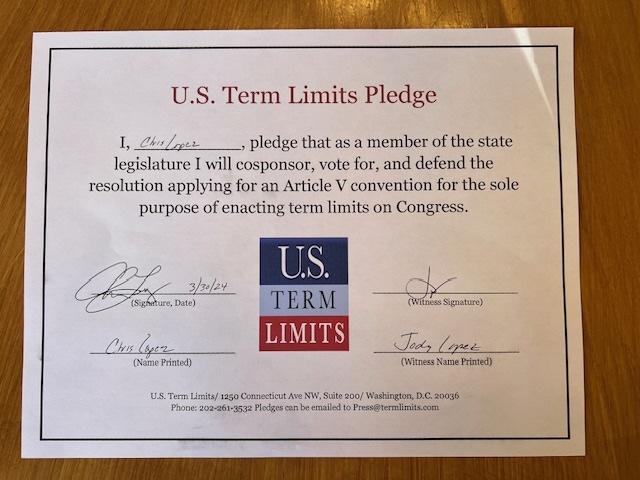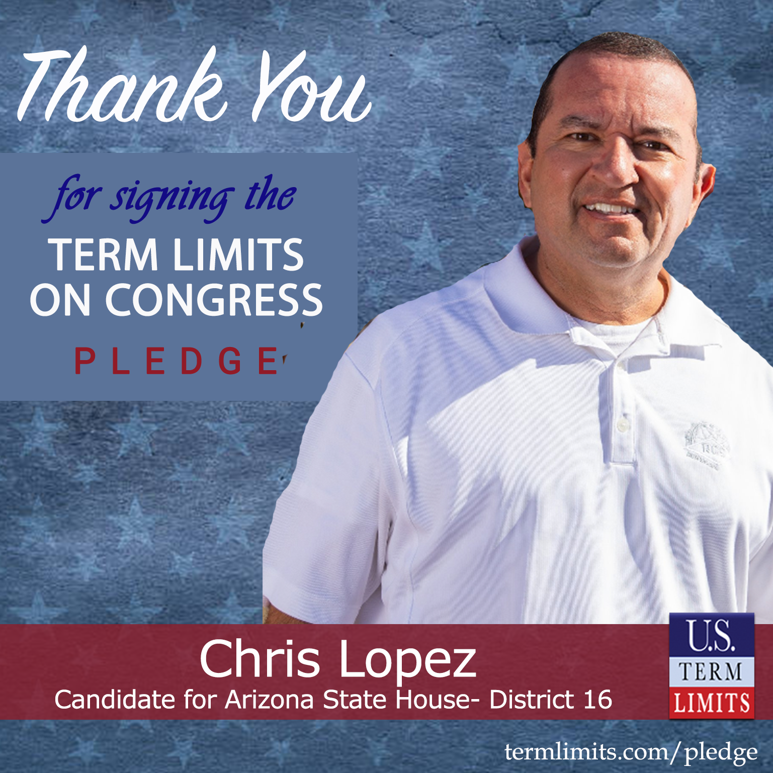 Casa Grande, AZ – U.S. Term Limits (USTL), the leader in the national, non-partisan movement to limit terms for elected officials, is gathering support from state lawmakers across the nation. Its mission is to get 34 states to apply for an amendment proposal convention specific to term limits on Congress. Arizona state house candidate, Chris Lopez (District 16), has committed support for term limits on Congress by signing the term limits convention pledge. Previously, candidates Gabby Mercer and Rob Hudelson also signed the pledge.