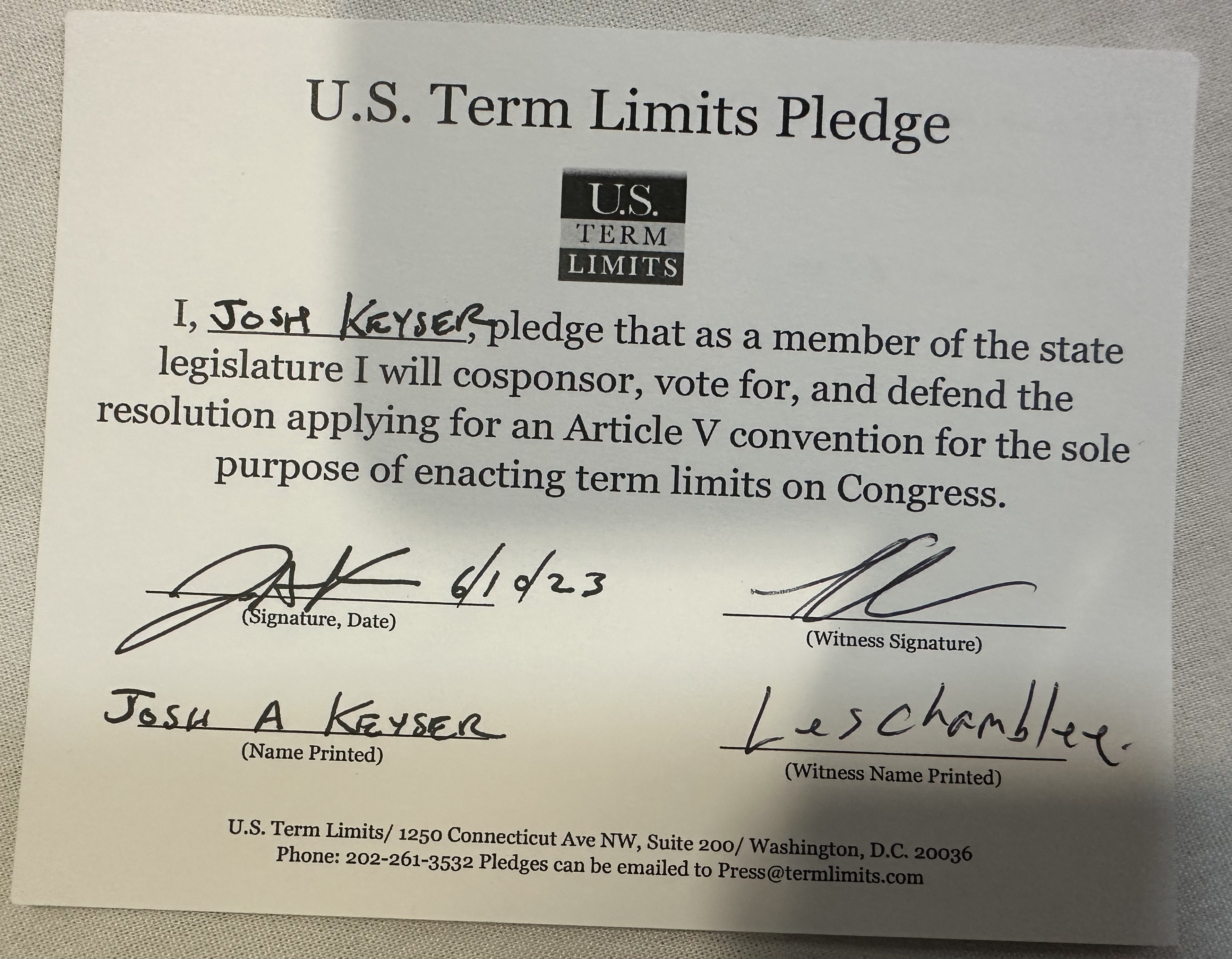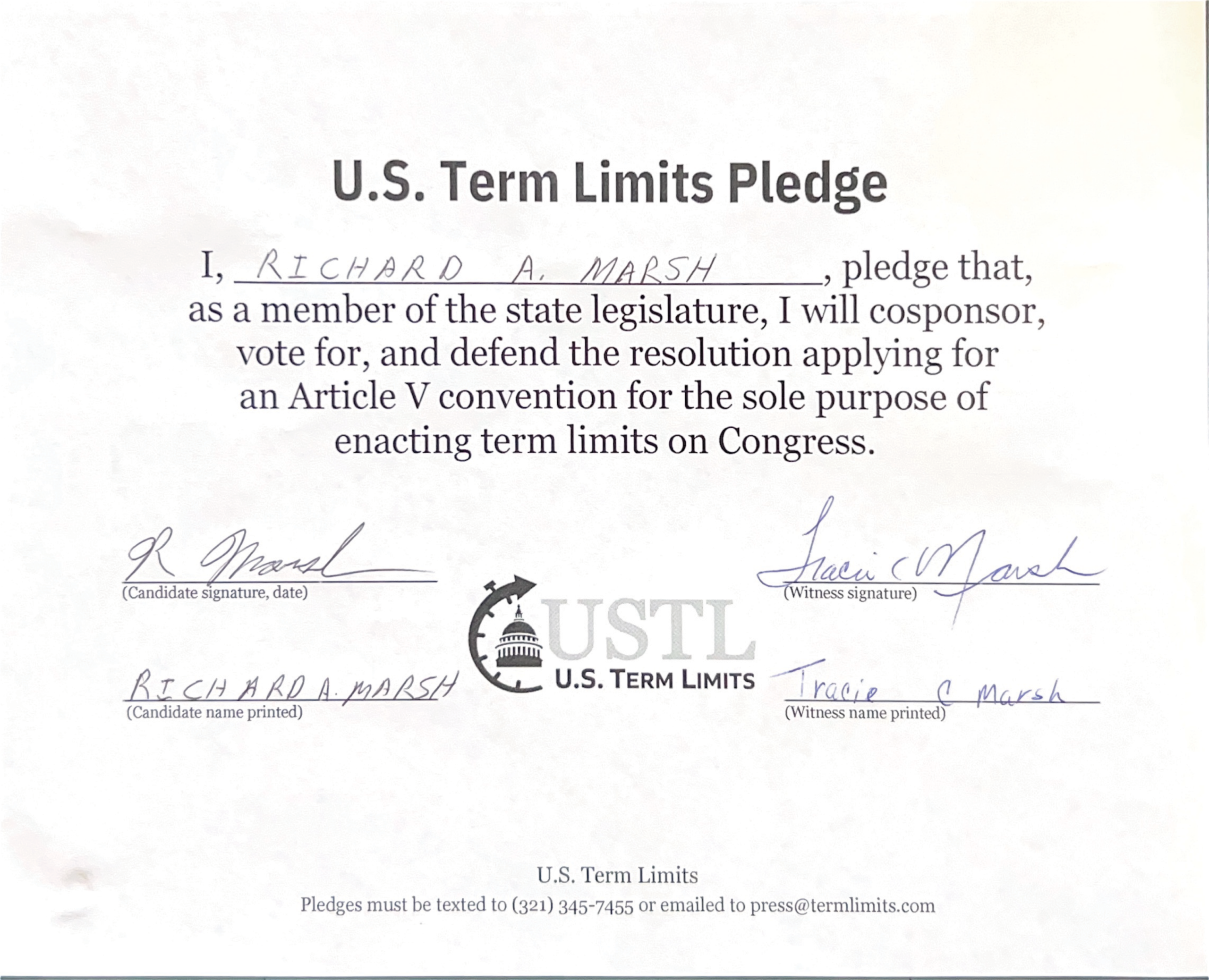 The U.S. Term Limits pledge is provided to candidates and members of state legislatures. It reads, “I pledge that, as a member of the state legislature, I will cosponsor, vote for, and defend the resolution applying for an Article V convention for the sole purpose of enacting term limits on Congress.”