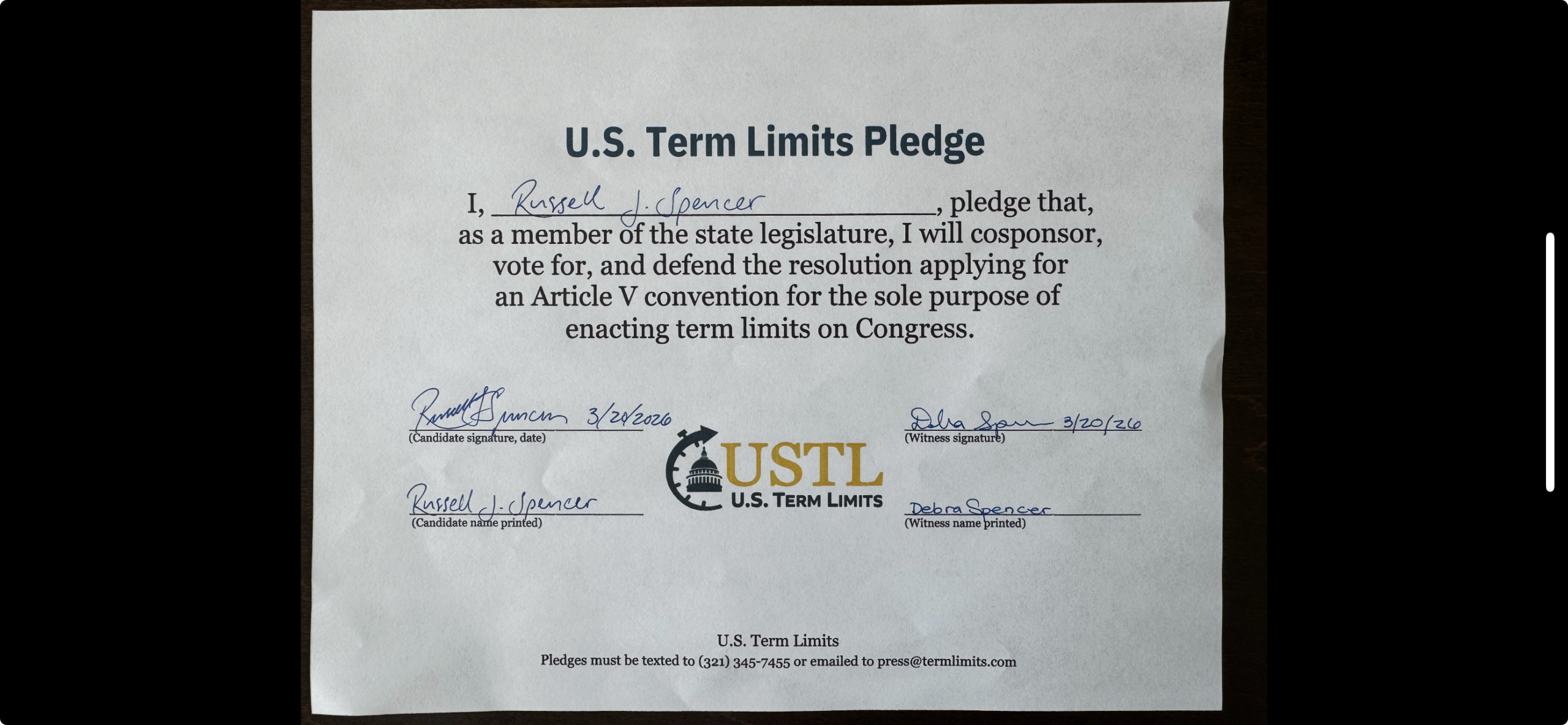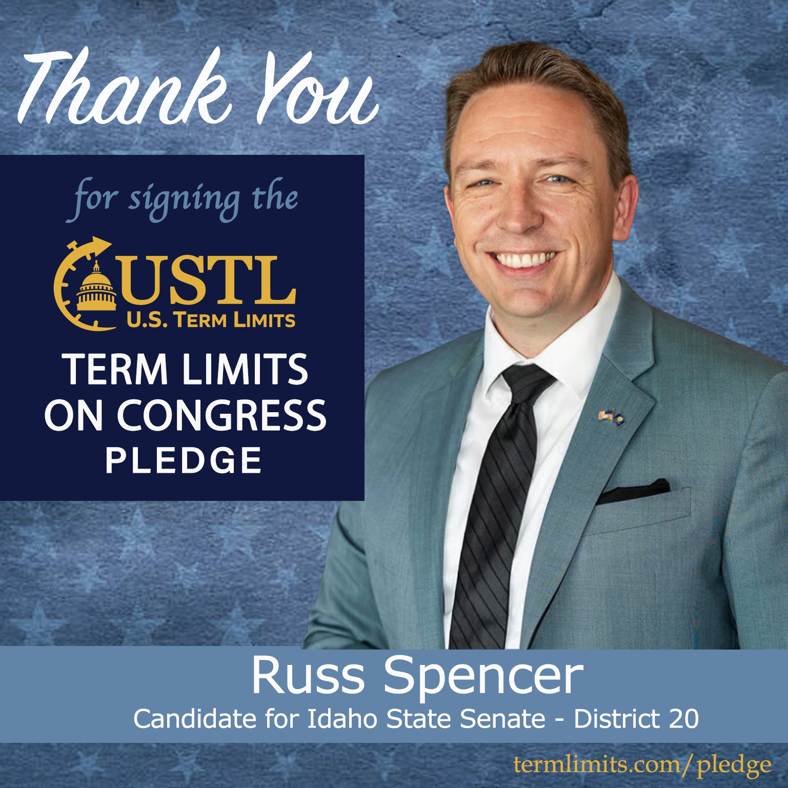 Meridian, ID – U.S. Term Limits (USTL), the leader in the national, non-partisan movement to limit terms for elected officials, is gathering support from state lawmakers across the nation. Its mission is to get 34 states to apply for an amendment proposal convention specific to term limits on Congress. 2026 Idaho state senate candidate, Russ Spencer (district 20), has committed support for term limits on Congress by signing the term limits convention pledge. Previously, candidate Richard Marsh and incumbent Senator Josh Keyser also signed the pledge.
