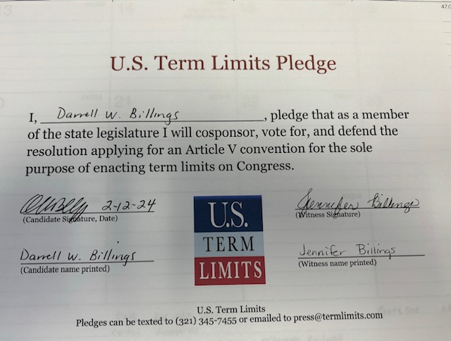 The U.S. Term Limits pledge is provided to candidates and members of state legislatures. It reads, “I pledge that, as a member of the state legislature, I will cosponsor, vote for, and defend the resolution applying for an Article V convention for the sole purpose of enacting term limits on Congress.”
