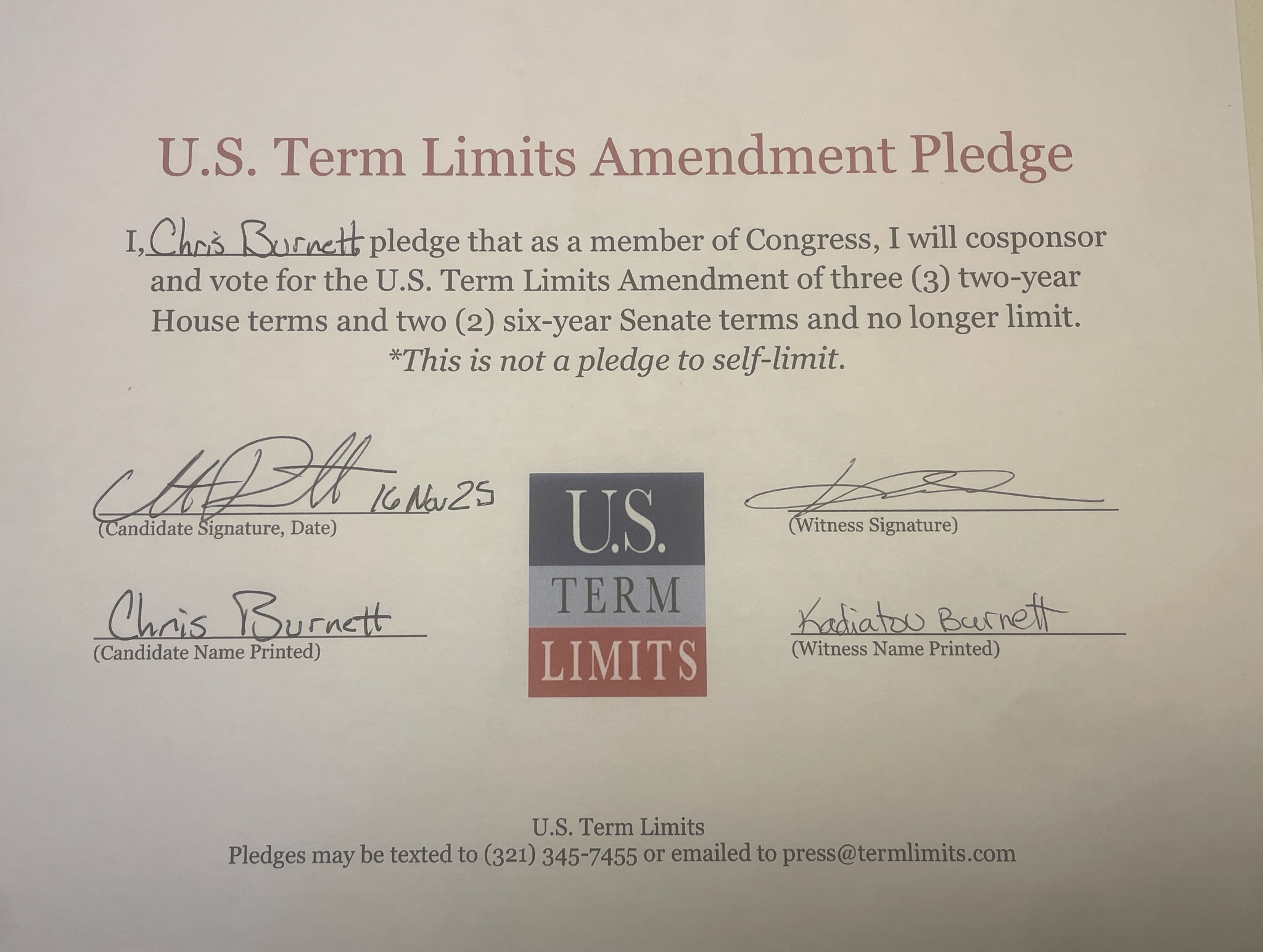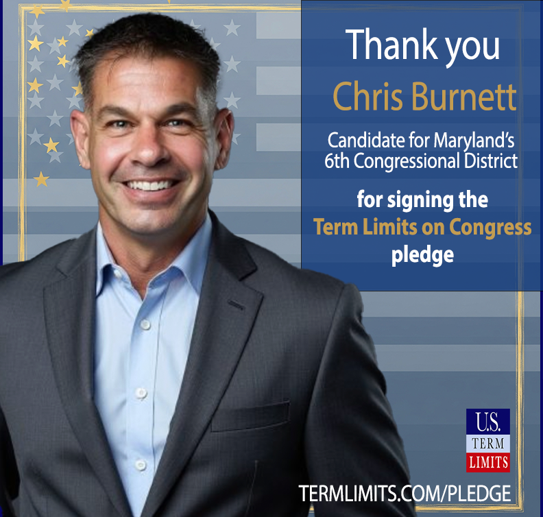 Washington D.C. – U.S. Term Limits (USTL), the leader in the non-partisan national movement to limit terms for elected officials, praises 2026 U.S. House candidate for Maryland, Chris Burnett (district 6), for signing the pledge for an amendment to term limit Congress. Previously, candidates Neil Parrott and Ethan Wechtaluk signed the pledge.