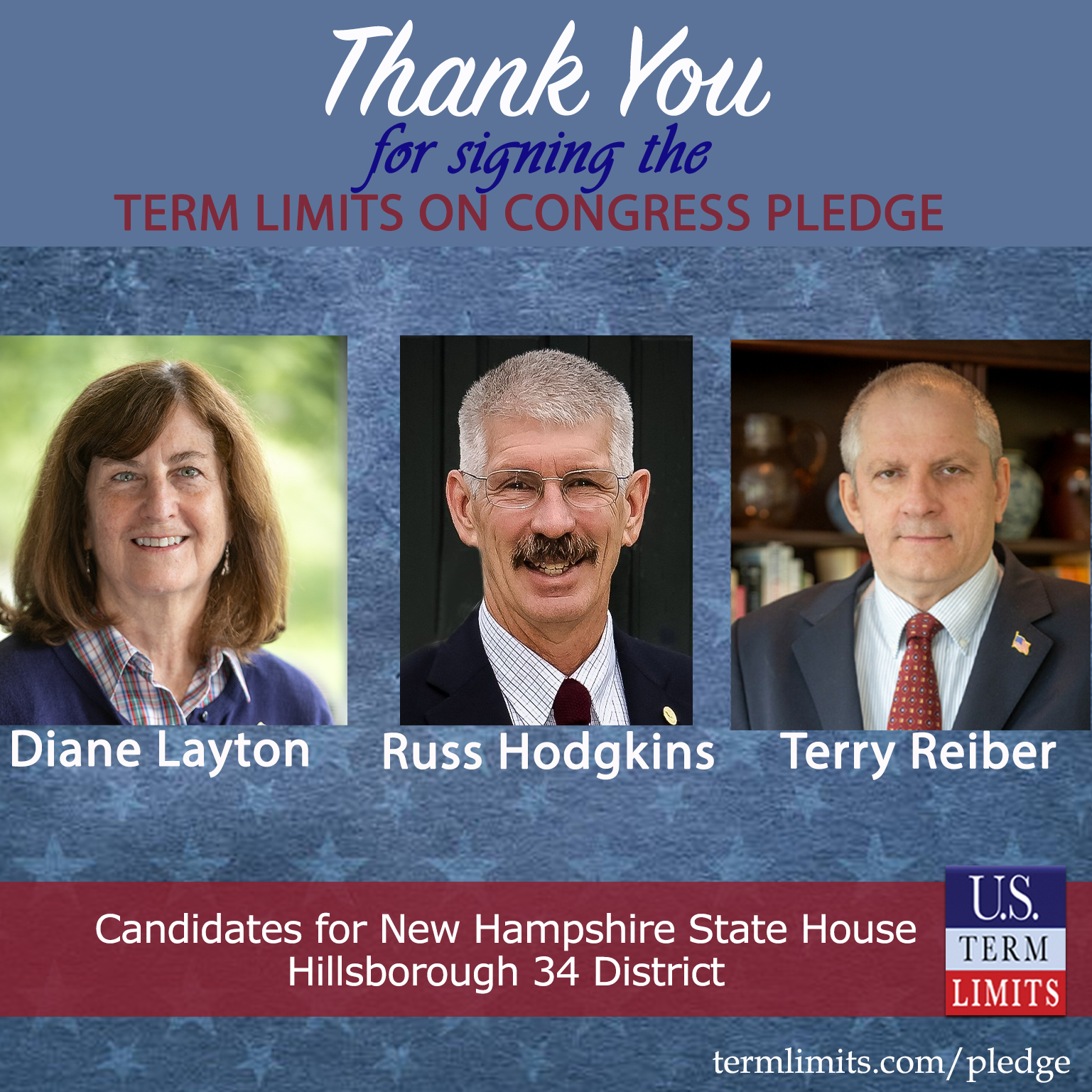Amherst, NH – U.S. Term Limits (USTL), the leader in the national, non-partisan movement to limit terms for elected officials, is gathering support from state lawmakers across the nation. Its mission is to get 34 states to apply for an amendment proposal convention specific to term limits on Congress. New Hampshire state house candidates, Diane Layton, Russ Hodgkins and Terry Reiber (Hillsborough 34), have committed support for term limits on Congress by signing the term limits convention pledge.