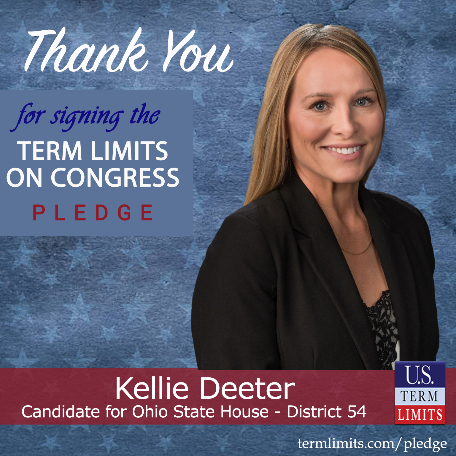 Columbus, OH – U.S. Term Limits (USTL), the leader in the national, non-partisan movement to limit terms for elected officials, is gathering support from state lawmakers across the nation. Its mission is to get 34 states to apply for an amendment proposal convention specific to term limits on Congress. Ohio state house candidate, Kellie Deeter (District 54), has committed support for term limits on Congress by signing the term limits convention pledge. Previously, Rep. Dick Stein and candidate Anthony Savage also signed the pledge.