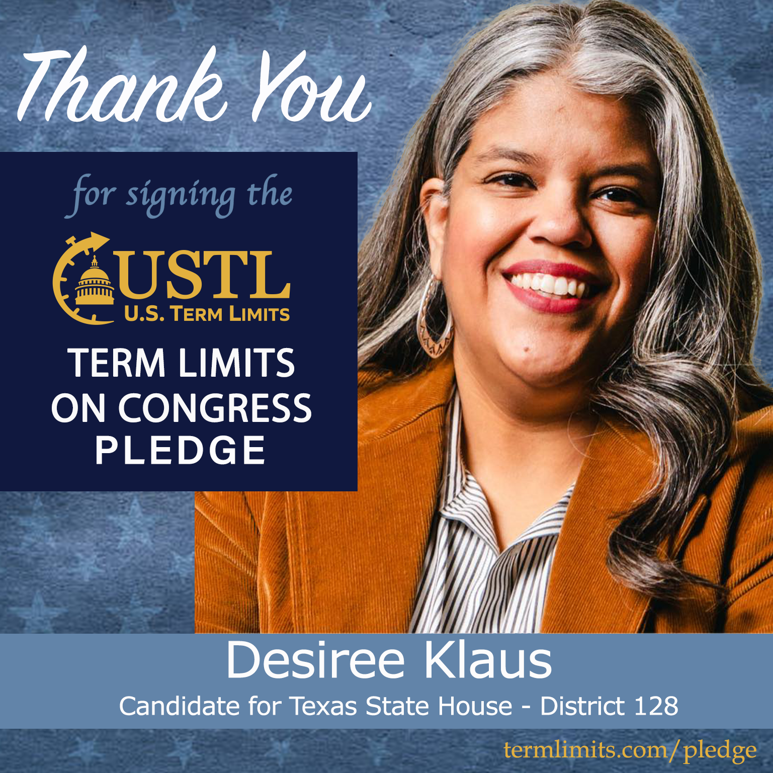 Highlands, TX – U.S. Term Limits (USTL), the leader in the national, non-partisan movement to limit terms for elected officials, is gathering support from state lawmakers across the nation. Its mission is to get 34 states to apply for an amendment proposal convention specific to term limits on Congress. Texas state house candidate, Desiree Klaus (district 128), has committed support for term limits on Congress by signing the term limits convention pledge. Previously, candidates Tom Butler and Mike Wolfe signed the term limits pledge.