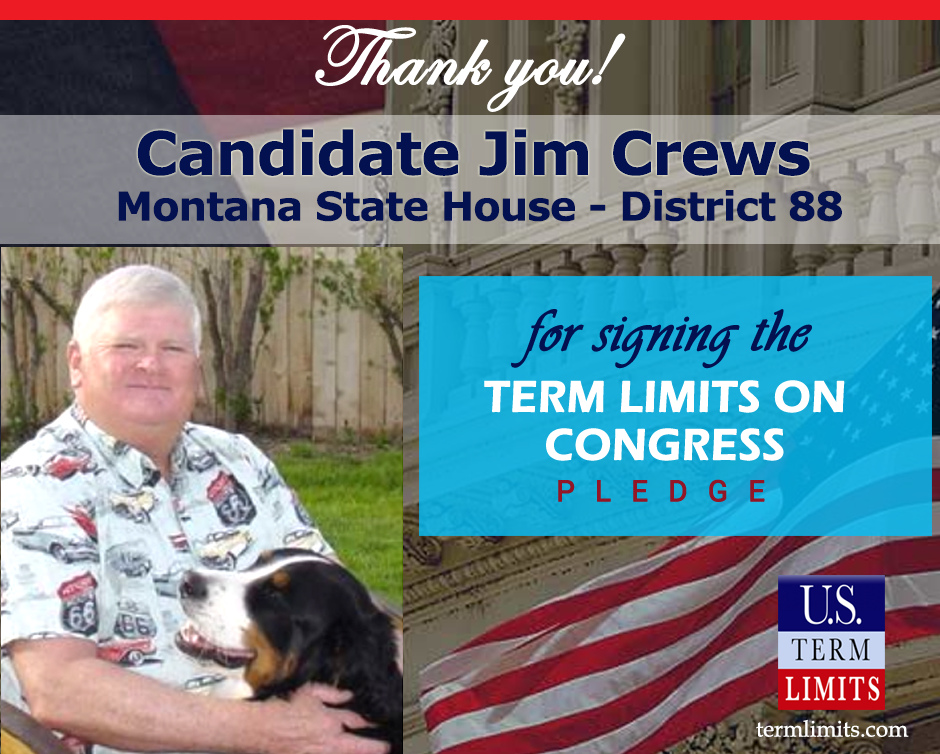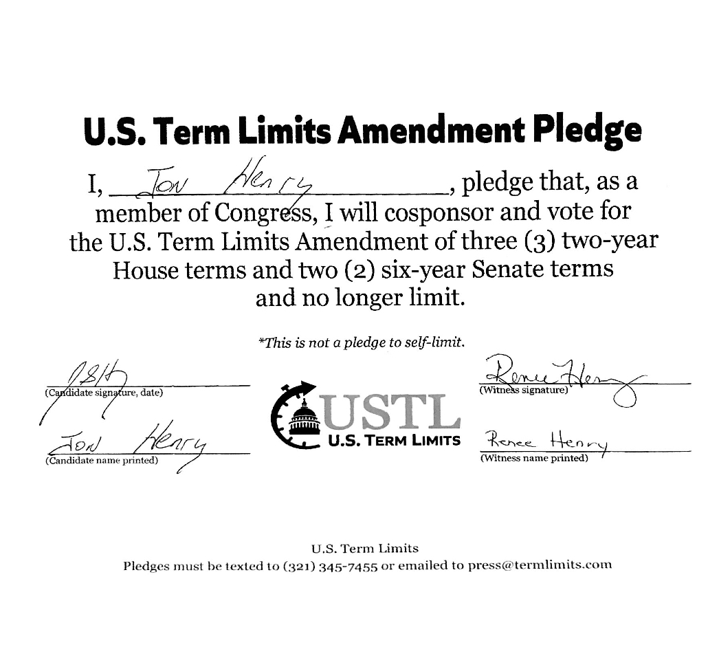 The U.S. Term Limits amendment pledge is provided to every announced candidate for federal office. It reads, “I pledge that as a member of Congress, I will cosponsor and vote for the U.S. Term Limits amendment of three (3) two-year House terms and two (2) six-year Senate terms and no longer limit.”