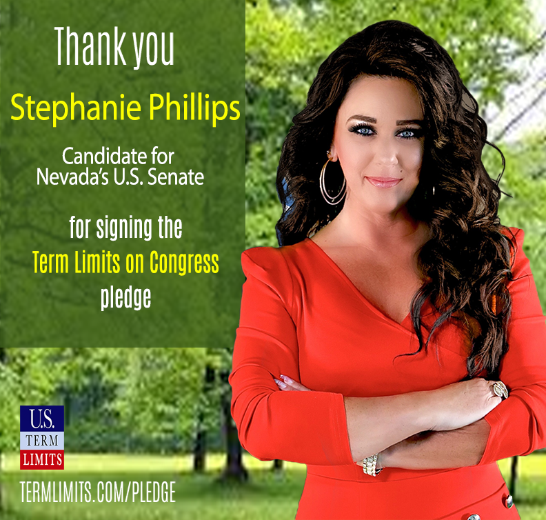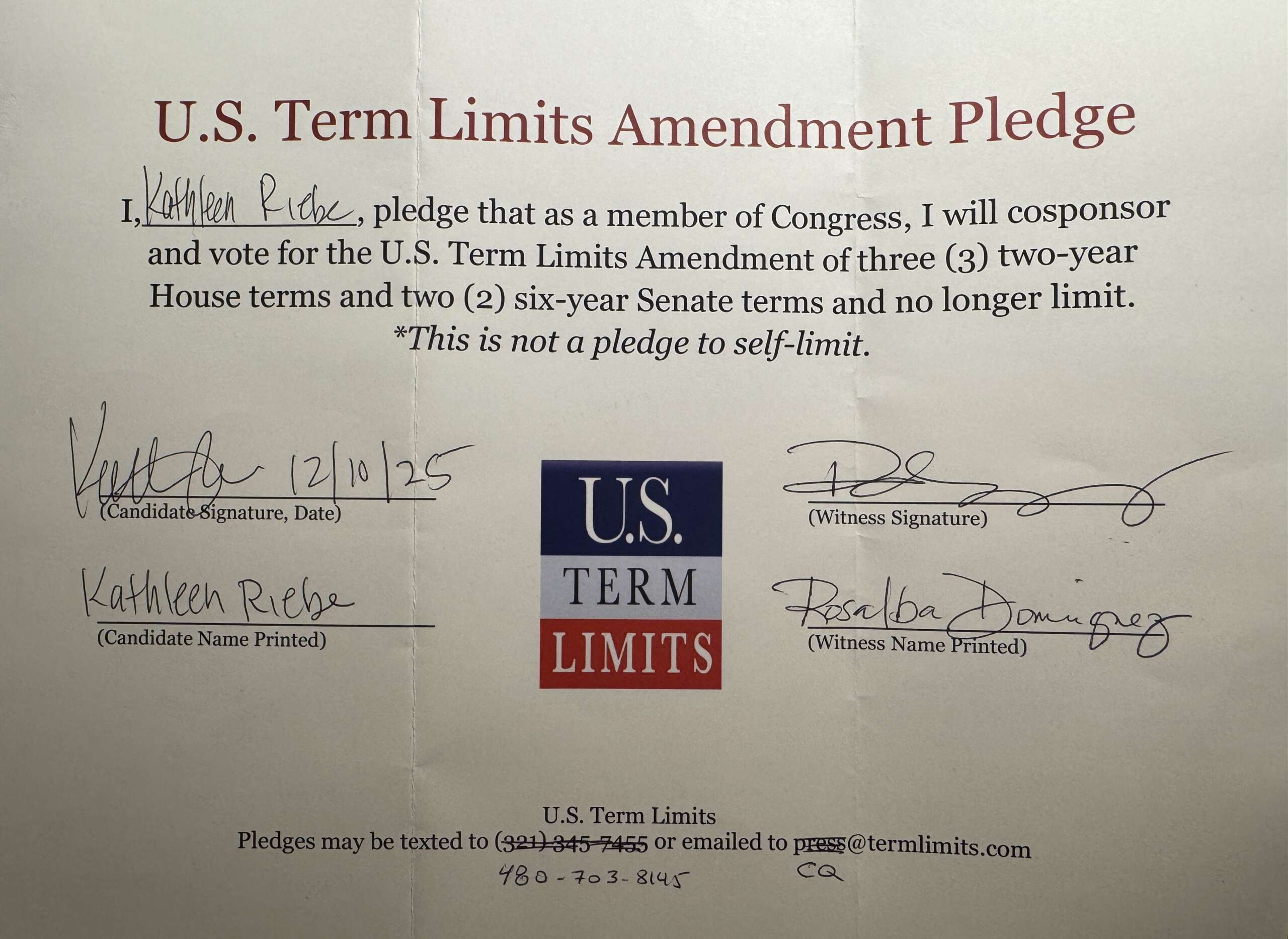 The U.S. Term Limits amendment pledge is provided to every announced candidate for federal office. It reads, “I pledge that as a member of Congress, I will cosponsor and vote for the U.S. Term Limits amendment of three (3) two-year House terms and two (2) six-year Senate terms and no longer limit.”