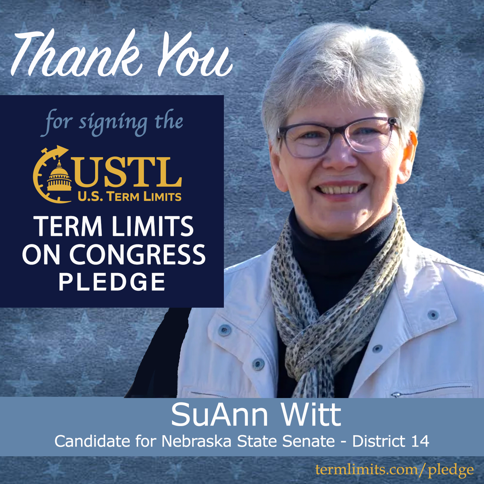 Papillion, NE – U.S. Term Limits (USTL), the leader in the national, non-partisan movement to limit terms for elected officials, is gathering support from state lawmakers across the nation. Its mission is to get 34 states to apply for an amendment proposal convention specific to term limits on Congress. 2026 Nebraska state senate candidate, SuAnn Witt (district 14), has committed support for term limits on Congress by signing the term limits convention pledge. Previously, candidate Bill Bowes also signed.
