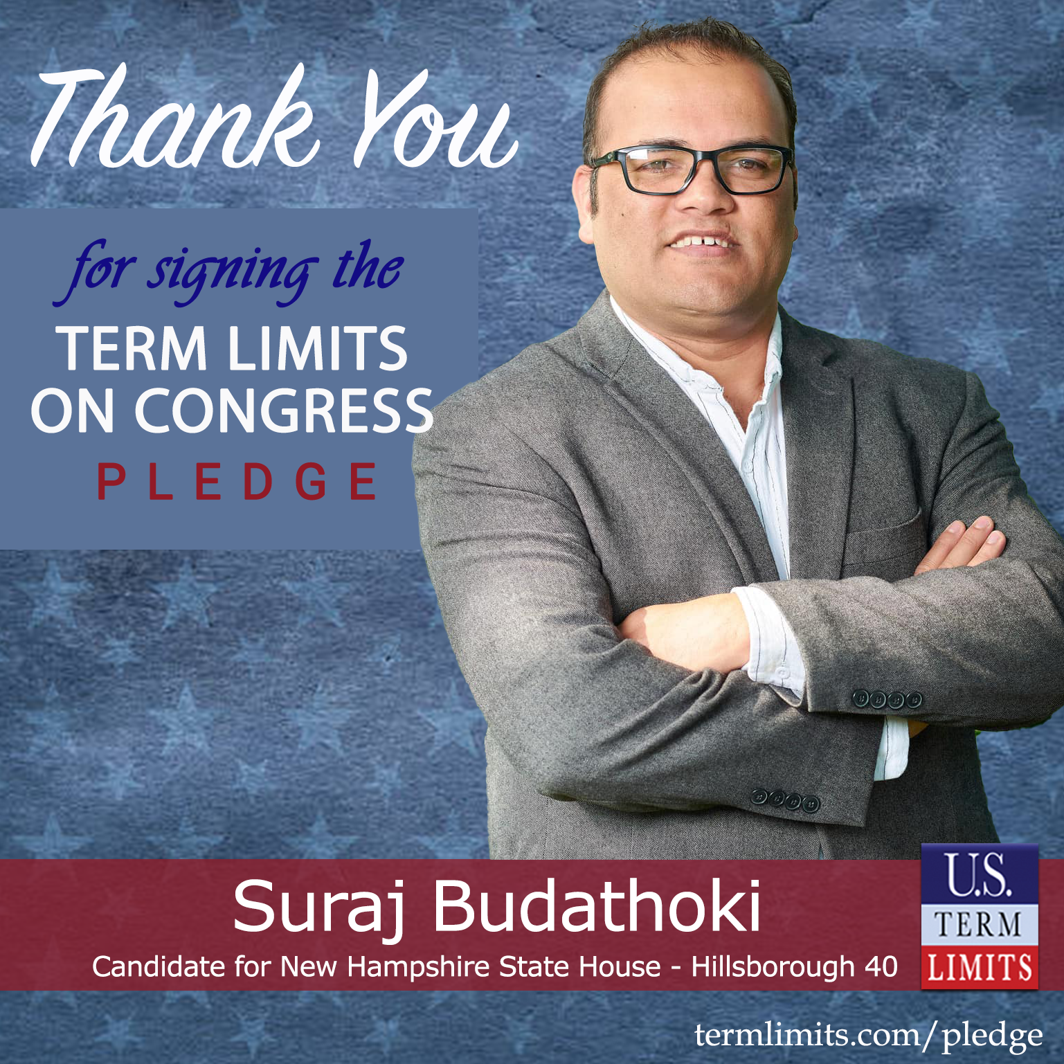 Manchester, NH – U.S. Term Limits (USTL), the leader in the national, non-partisan movement to limit terms for elected officials, is gathering support from state lawmakers across the nation. Its mission is to get 34 states to apply for an amendment proposal convention specific to term limits on Congress. New Hampshire state house candidate, Suraj Budathoki (Hillsborough 40), has committed support for term limits on Congress by signing the term limits convention pledge.