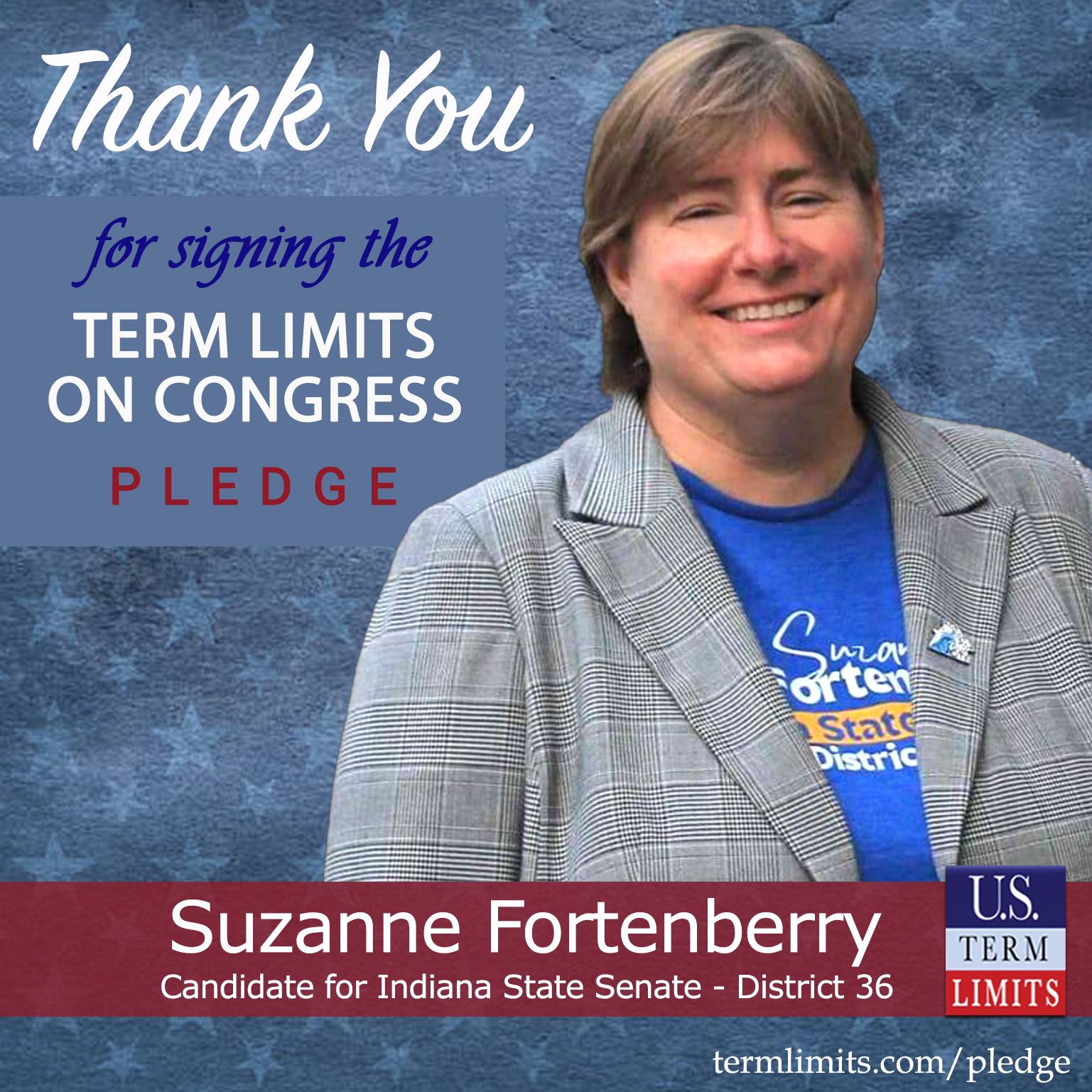 Greenwood, IN –  U.S. Term Limits (USTL), the leader in the national, non-partisan movement to limit terms for elected officials, is gathering support from state lawmakers across the nation. Its mission is to get 34 states to apply for an amendment proposal convention specific to term limits on Congress. Indiana state senate candidate, Suzanne Fortenberry (district 36), has committed support for term limits on Congress by signing the term limits convention pledge. Previously, incumbent Senator Cyndi Carrasco also signed the pledge.