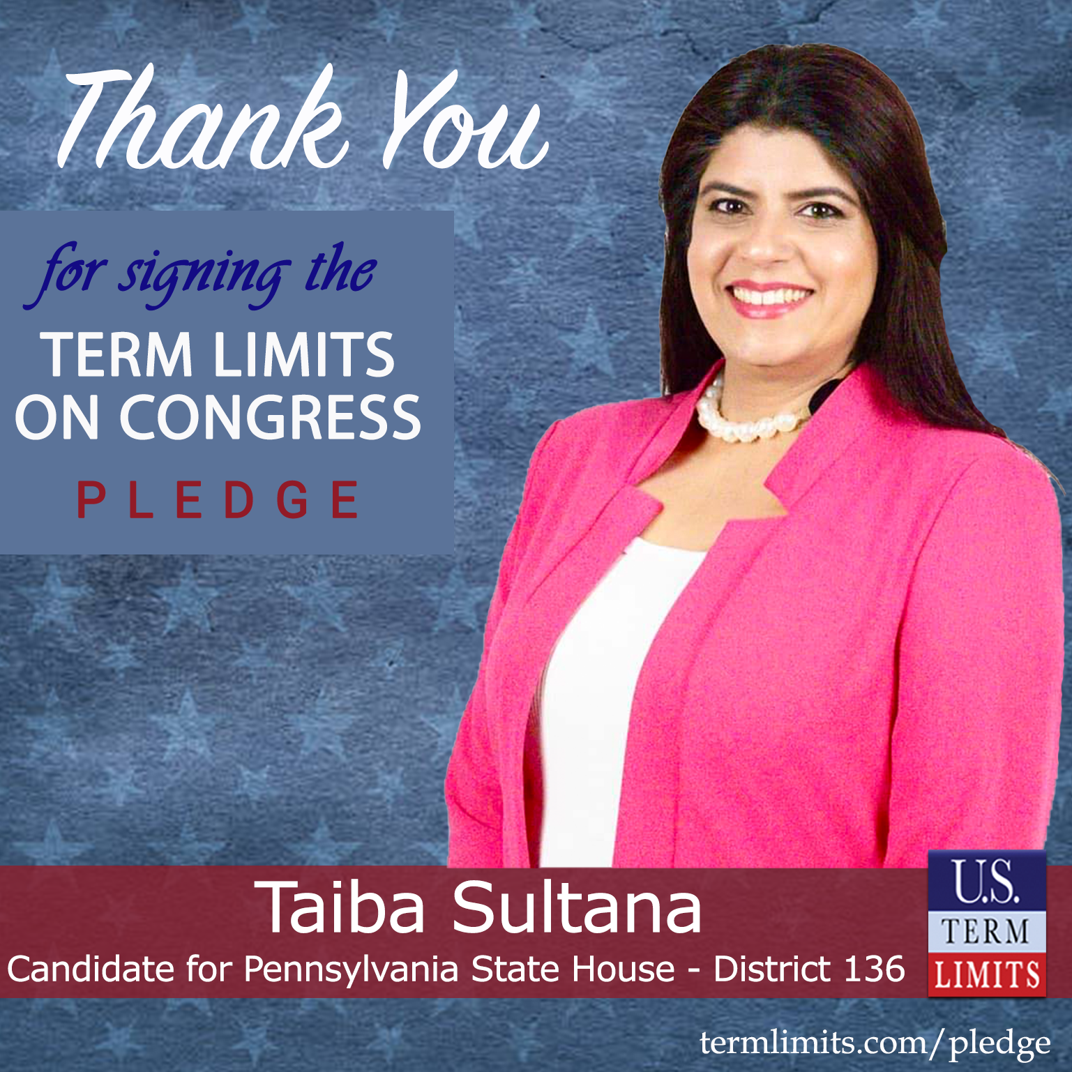 USTL President, Philip Blumel, commented on Sultana’s pledge saying, “Taiba’s strong support of term limits shows that there are individuals who are willing to listen to the majority of voters who want term limits. America needs a Congress that will be served by citizen legislators, not career politicians.”