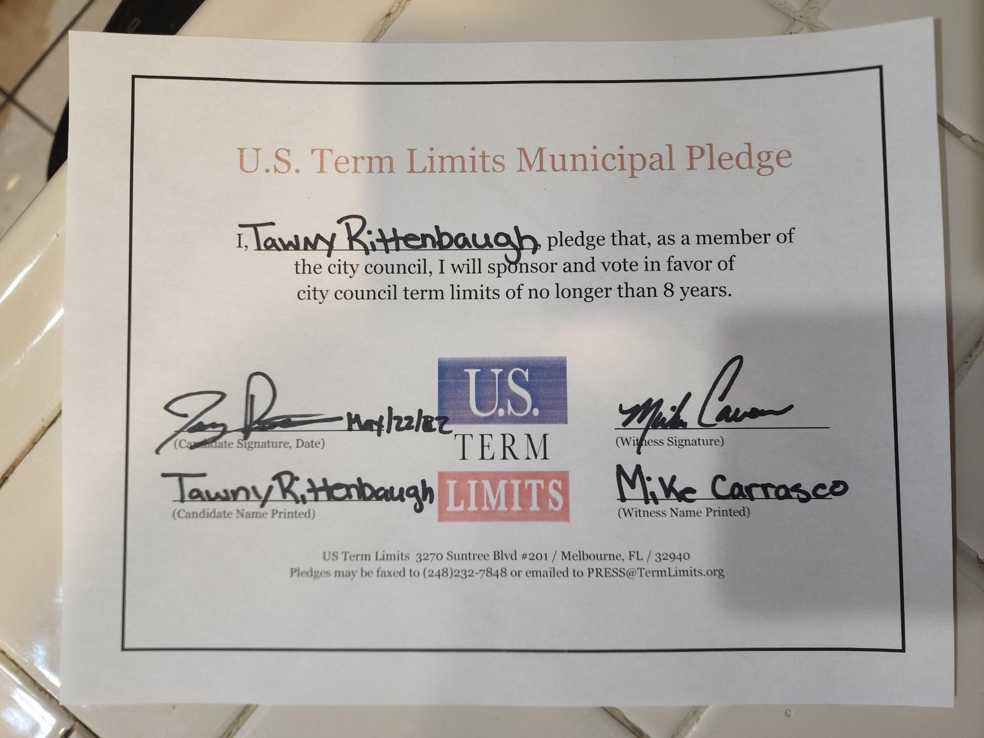 Tawny Rittenbaugh Pledges to Support Congressional Term Limits