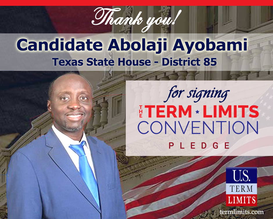 The U.S. Term Limits pledge is provided to candidates and members of state legislatures. It reads, “I pledge that, as a member of the state legislature, I will cosponsor, vote for, and defend the resolution applying for an Article V convention for the limited purpose of enacting term limits on Congress.”