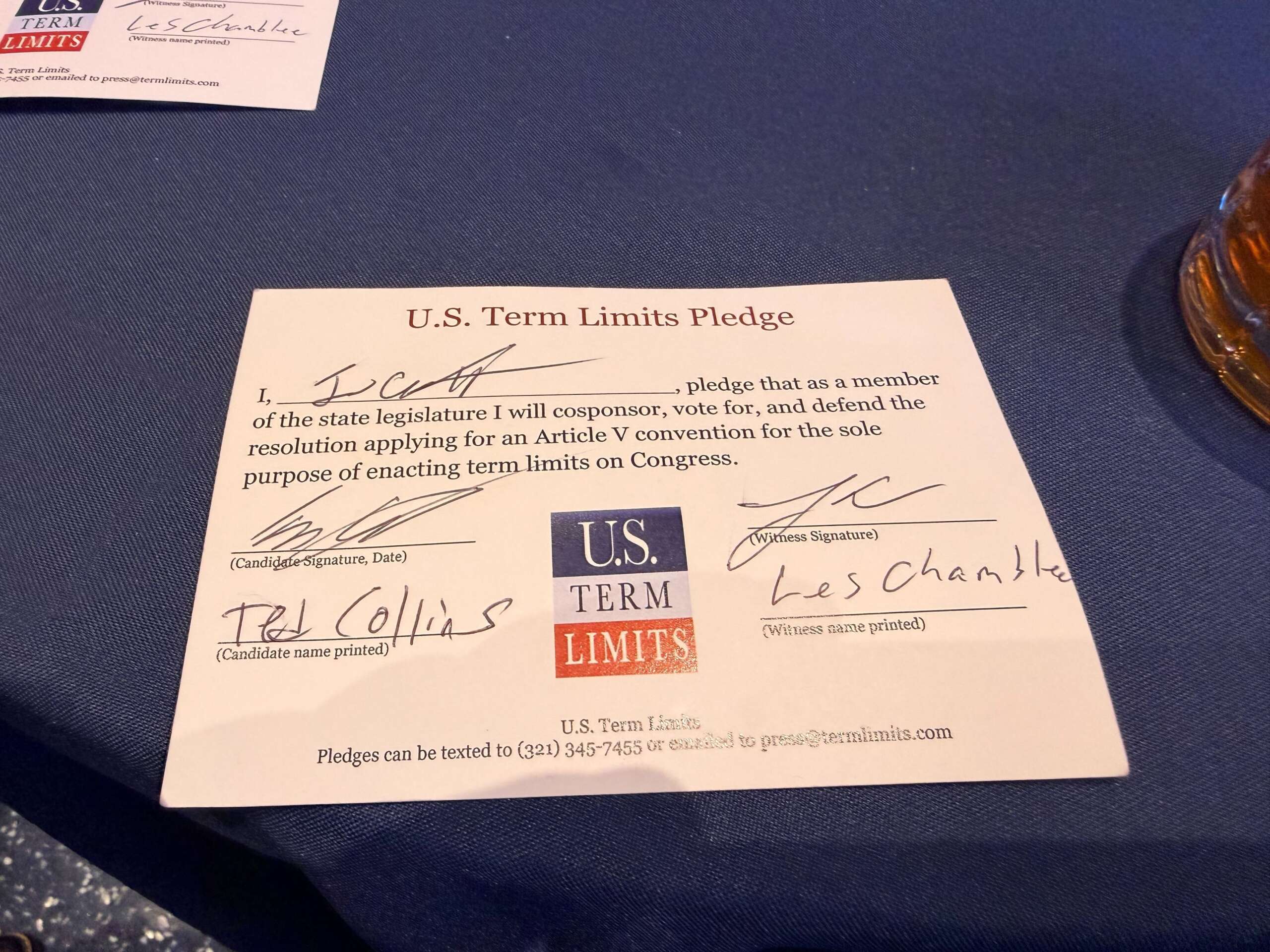 The U.S. Term Limits pledge is provided to candidates and members of state legislatures. It reads, “I pledge that, as a member of the state legislature, I will cosponsor, vote for, and defend the resolution applying for an Article V convention for the sole purpose of enacting term limits on Congress.”