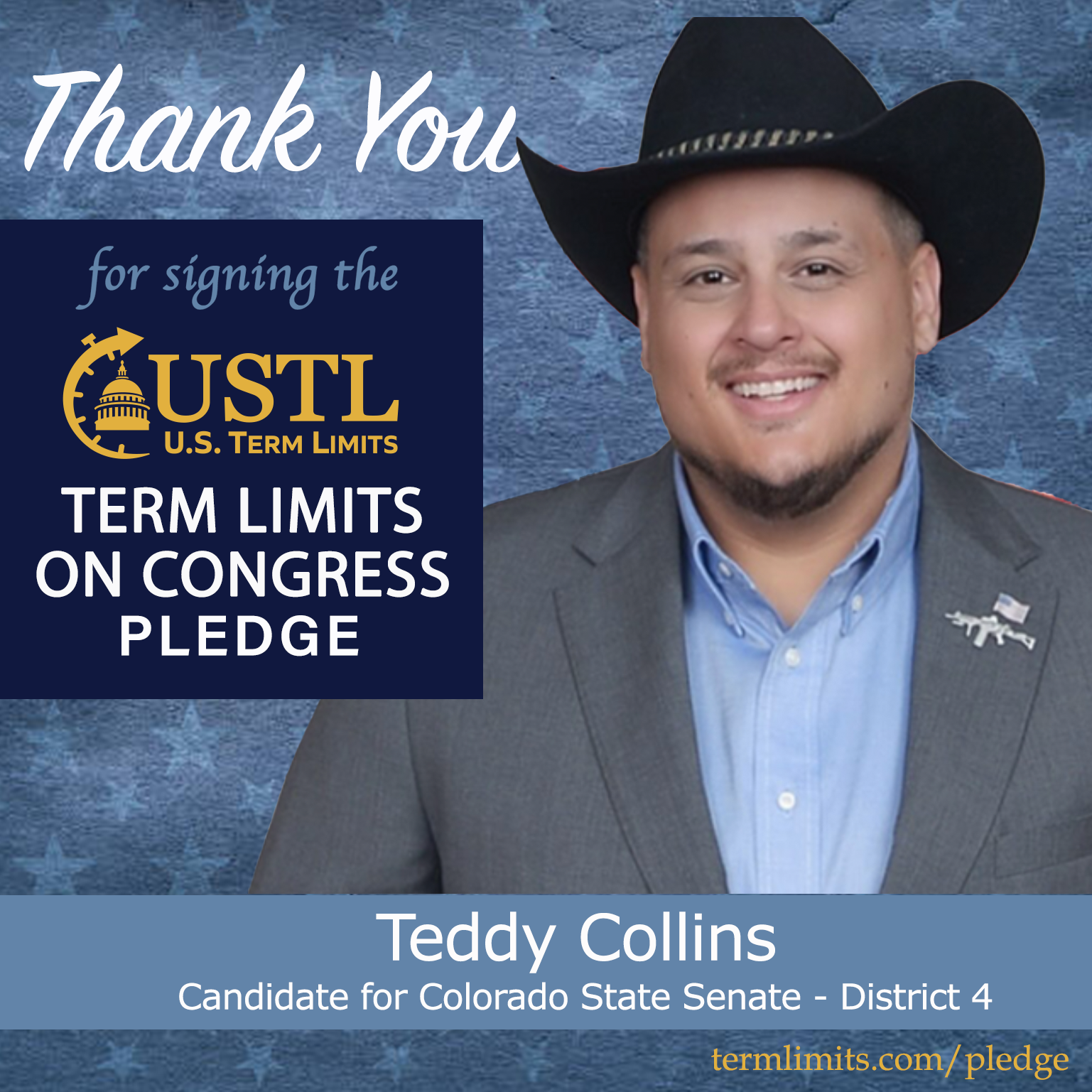 Castle Rock, CO – U.S. Term Limits (USTL), the leader in the national, non-partisan movement to limit terms for elected officials, is gathering support from state lawmakers across the nation. Its mission is to get 34 states to apply for an amendment proposal convention specific to term limits on Congress. Colorado state senate candidate Teddy Collins (district 4), has committed support for term limits on Congress by signing the term limits convention pledge.