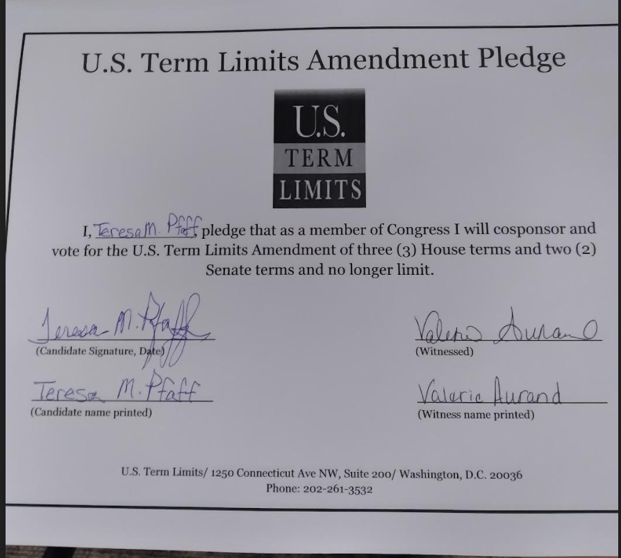 Washington D.C. – U.S. Term Limits (USTL), the leader in the non-partisan national movement to limit terms for elected officials, praises 2022 U.S. house candidate for Illinois, Teresa Pfaff (district 16), for signing the pledge for an amendment to term limit Congress. Previously, candidates Michael Rebresh and Jack Lombardi also signed the pledge.