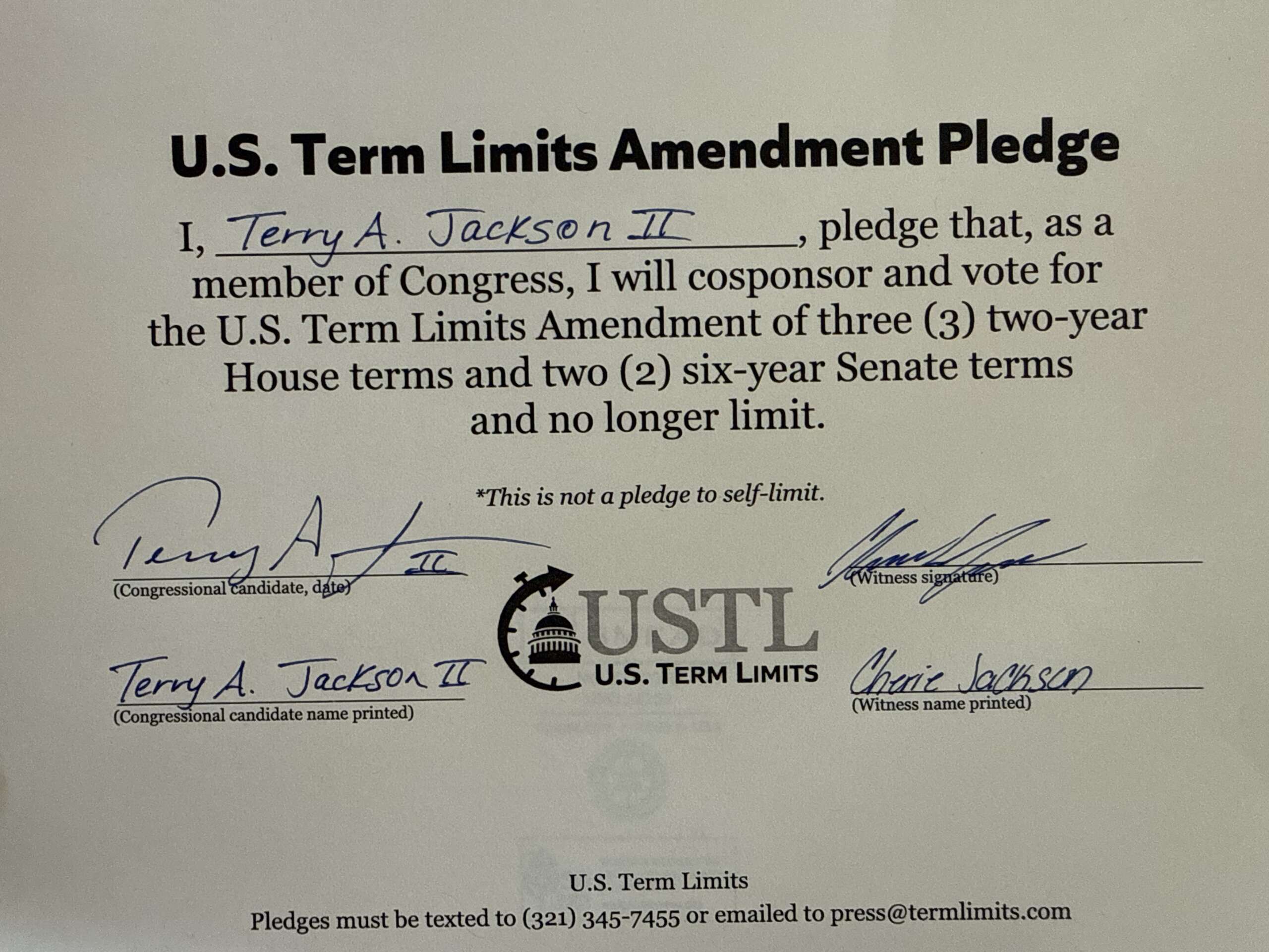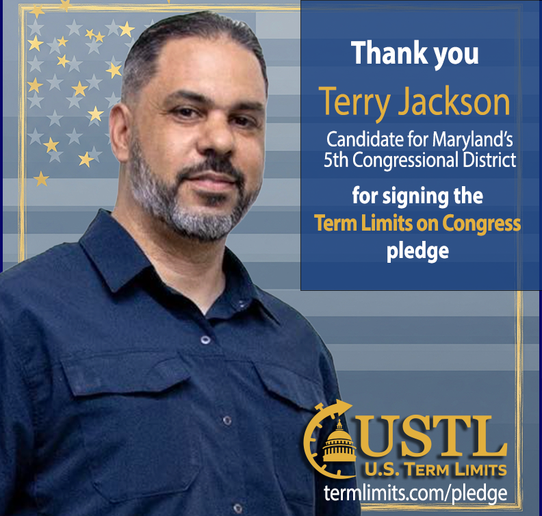 Washington D.C. – U.S. Term Limits (USTL), the leader in the non-partisan national movement to limit terms for elected officials, praises 2026 U.S. House candidate for Maryland, Terry Jackson (district 5), for signing the pledge for an amendment to term limit Congress. Previously, candidates Heather Luper, Leigha Messick, Jerry Lightfoot, Ellis Colvin, Harry Jarin, Jordan Eversley, Chris Chaffee and Mark Arness also signed the pledge.