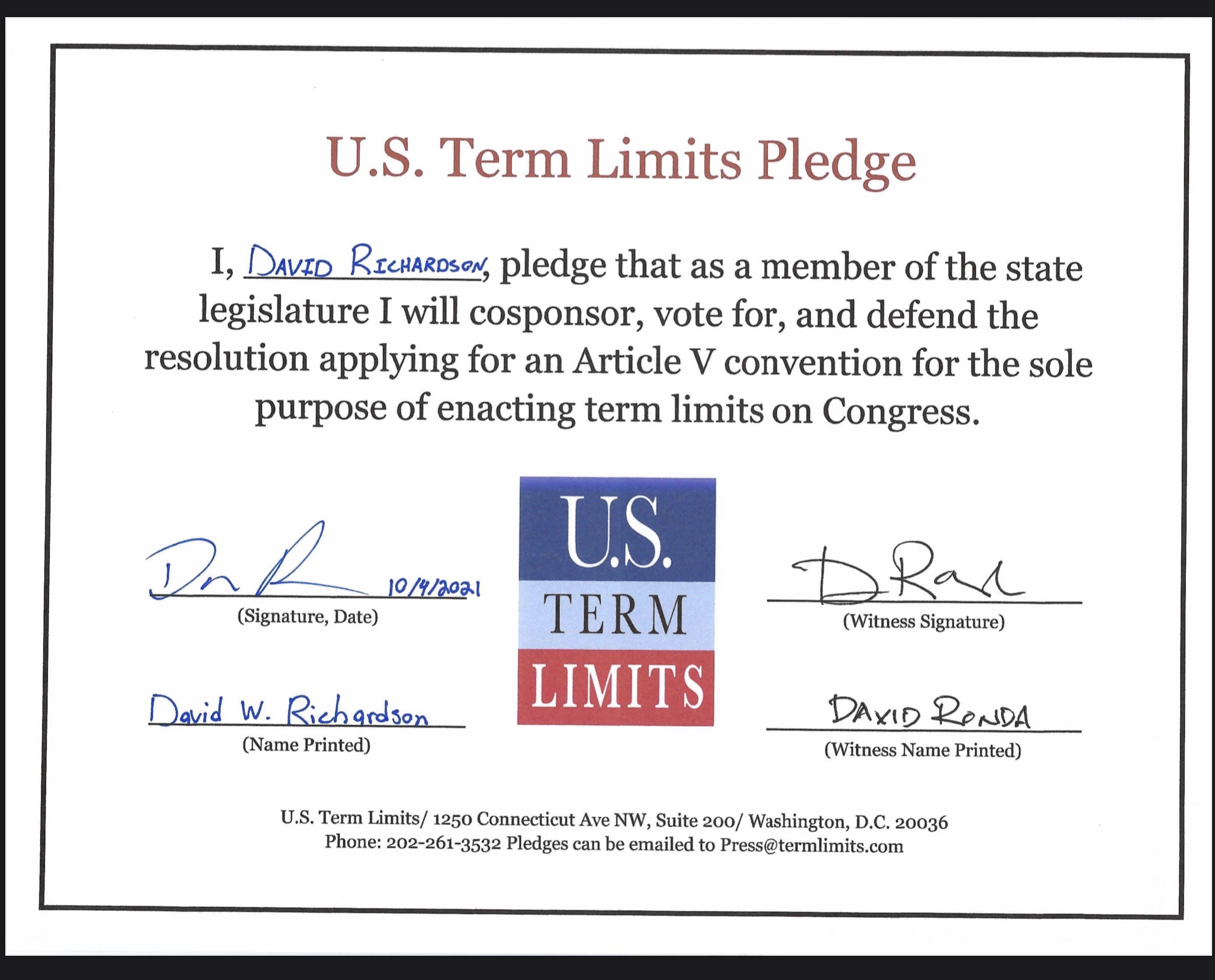 The U.S. Term Limits pledge is provided to candidates and members of state legislatures. It reads, “I pledge that, as a member of the state legislature, I will cosponsor, vote for, and defend the resolution applying for an Article V convention for the limited purpose of enacting term limits on Congress.”