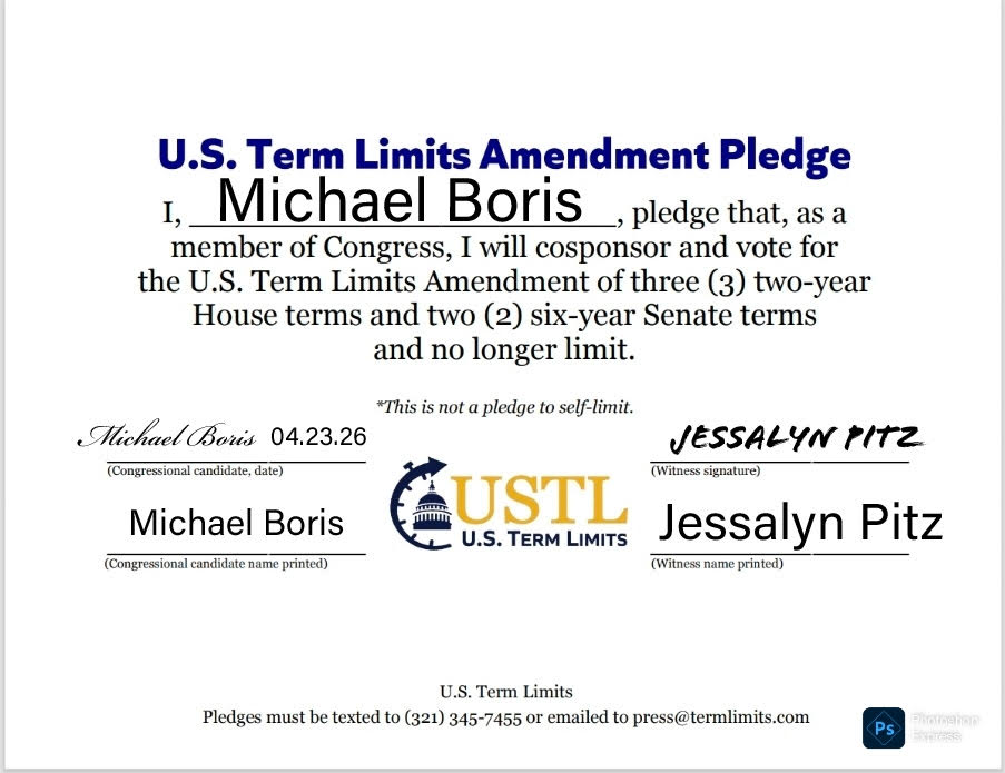 Washington D.C. – U.S. Term Limits (USTL), the leader in the non-partisan national movement to limit terms for elected officials, praises 2026 U.S. House candidate for Nevada, Michael Boris (district 1), for signing the pledge for an amendment to term limit Congress. Previously, candidates Bobby Khan, Jim Blockey, Joy Hoover, Carrie Buck and Gabriel Cornejo also signed the pledge.