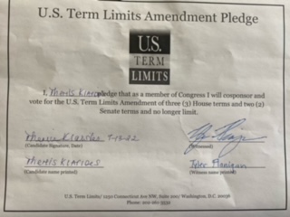 The U.S. Term Limits amendment pledge is provided to every announced candidate for federal office. It reads, “I pledge that as a member of Congress, I will cosponsor and vote for the U.S. Term Limits amendment of three (3) House terms and two (2) Senate terms and no longer limit.” The U.S. Term Limits constitutional amendment has been introduced in both the U.S. Senate by Senator Ted Cruz and his colleagues (SJR3) and the U.S. House by Representative Ralph Norman (HJR12).