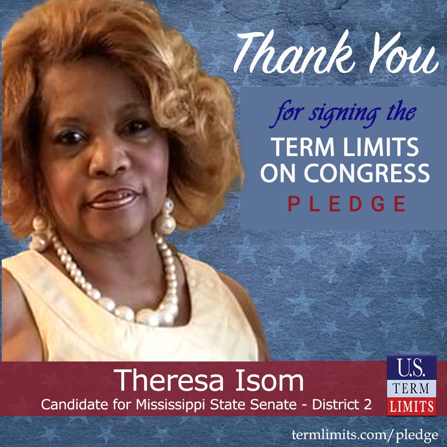 Jackson, MS – U.S. Term Limits (USTL), the leader in the national, non-partisan movement to limit terms for elected officials, is gathering support from state lawmakers across the nation. Its mission is to get 34 states to apply for an amendment proposal convention specific to term limits on Congress. 2025 Mississippi state senate candidate, Theresa Isom (district 2), has committed support for term limits on Congress by signing the term limits convention pledge. Previously, candidate Charlie Hoots also signed the pledge. The special primary election is scheduled for August 5, 2025.