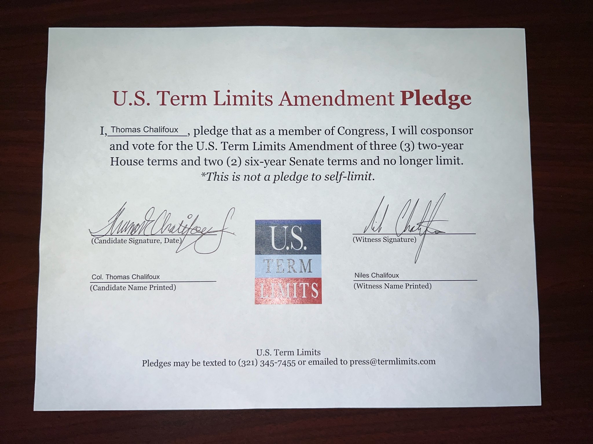Thomas Chalifoux Pledges to Support Term Limits on Congress