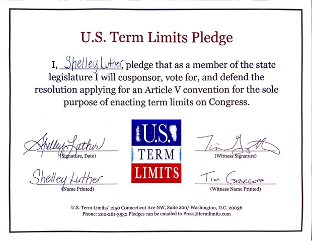 The U.S. Term Limits pledge is provided to candidates and members of state legislatures. It reads, “I pledge that, as a member of the state legislature, I will cosponsor, vote for, and defend the resolution applying for an Article V convention for the sole purpose of enacting term limits on Congress.”