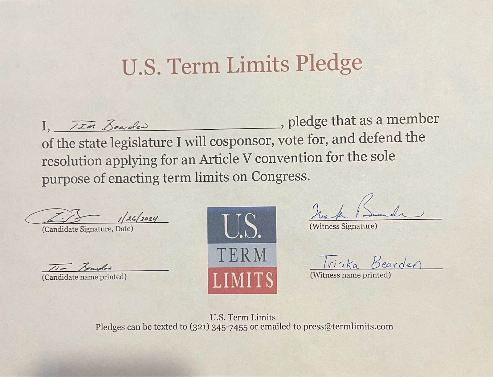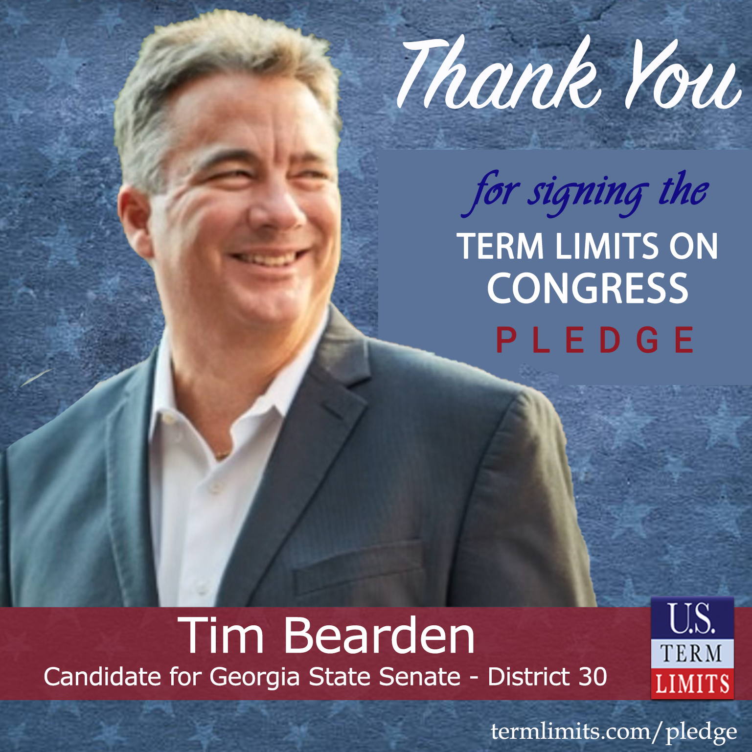 Bremen, GA – U.S. Term Limits (USTL), the leader in the national, non-partisan movement to limit terms for elected officials, is gathering support from state lawmakers across the nation. Its mission is to get 34 states to apply for an amendment proposal convention specific to term limits on Congress. Georgia state senate candidate, Tim Bearden (District 30), has committed support for term limits on Congress by signing the term limits convention pledge. Previously, candidates Renae Bell and Bob Smith also signed the pledge.