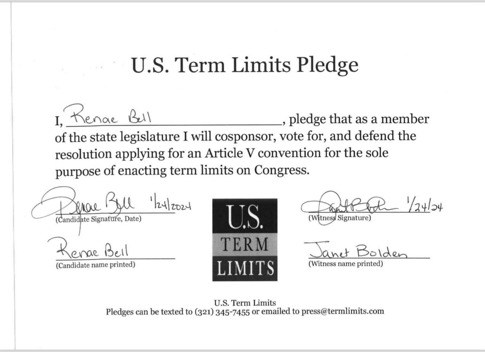 The U.S. Term Limits pledge is provided to candidates and members of state legislatures. It reads, “I pledge that, as a member of the state legislature, I will cosponsor, vote for, and defend the resolution applying for an Article V convention for the sole purpose of enacting term limits on Congress.”