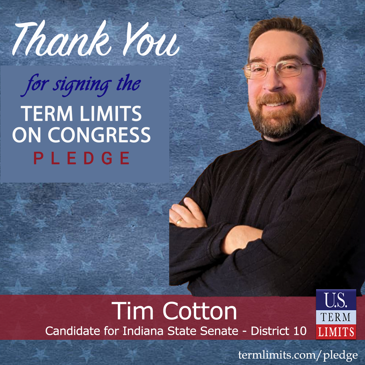 South Bend, IN – U.S. Term Limits (USTL), the leader in the national, non-partisan movement to limit terms for elected officials, is gathering support from state lawmakers across the nation. Its mission is to get 34 states to apply for an amendment proposal convention specific to term limits on Congress. Indiana state senate candidate, Tim Cotton (district 10), has committed support for term limits on Congress by signing the term limits convention pledge.