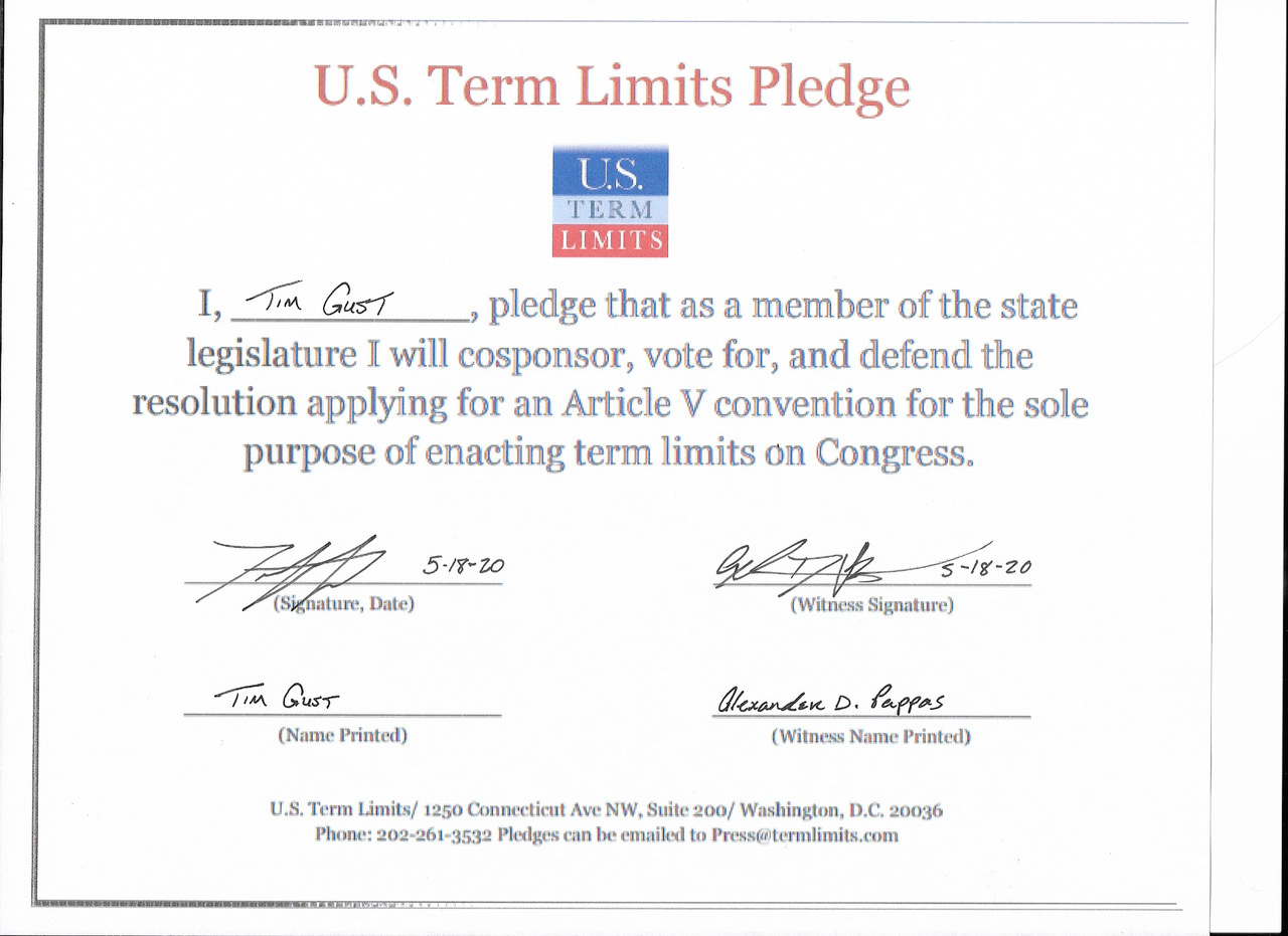Washington, D.C. – U.S. Term Limits (USTL), the leader in the national, non-partisan movement to limit terms for elected officials, is gathering support from state lawmakers across the nation. Its mission is to get 34 states to apply for an amendment proposal convention specific to term limits on Congress. 2020 Indiana state house candidate Tim Gust (district 20), has committed support for term limits on Congress by signing the Term Limits Convention pledge. Previously, Rep. Jim Pressel also signed the pledge. The primary election is scheduled for June 2, 2020.