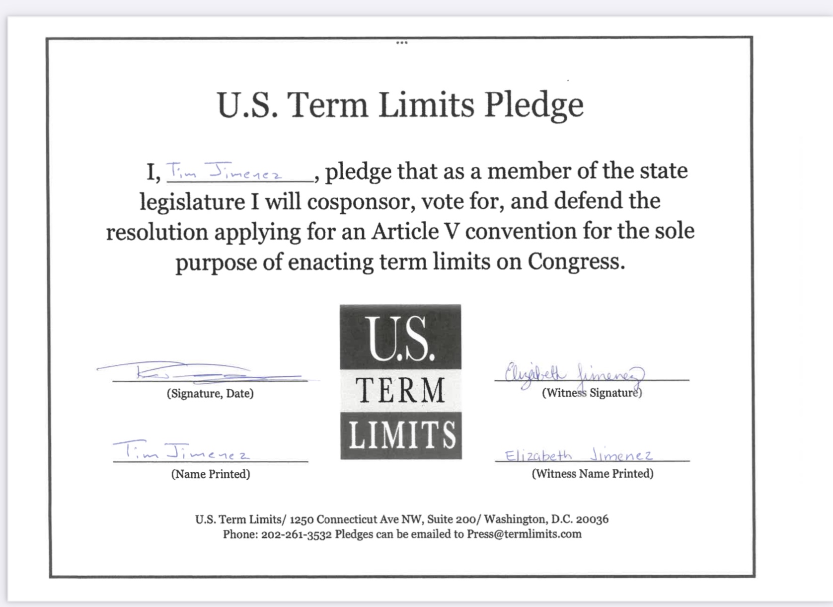 Tim Jimenez Pledges to Support Congressional Term Limits