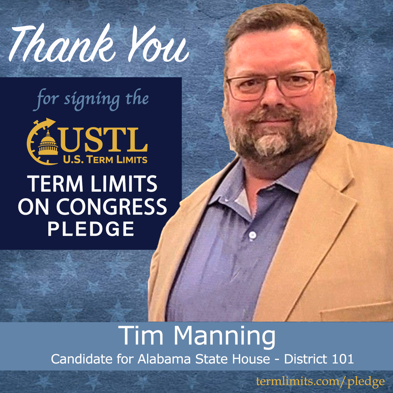 Petaluma, AL – U.S. Term Limits (USTL), the leader in the national, non-partisan movement to limit terms for elected officials, is gathering support from state lawmakers across the nation. Its mission is to get 34 states to apply for an amendment proposal convention specific to term limits on Congress. Alabama state house candidate, Tim Manning (District 101), has committed support for term limits on Congress by signing the term limits convention pledge.