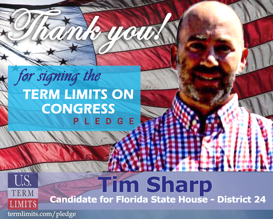 Jacksonville, FL– U.S. Term Limits (USTL), the leader in the national, non-partisan movement to limit terms for elected officials, is gathering support from state lawmakers across the nation. Its mission is to get 34 states to apply for an amendment proposal convention specific to term limits on Congress. Florida state house candidate, Tim Sharp (district 24), has committed support for term limits on Congress by signing the U.S. Term Limits pledge. Sharp is the first signer in this race.