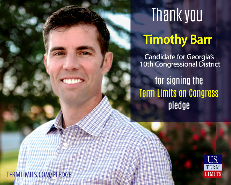 Washington D.C. – U.S. Term Limits (USTL), the leader in the non-partisan national movement to limit terms for elected officials, praises 2022 U.S. house candidate for Georgia, Timothy Barr (district 10), for signing the pledge for an amendment to term limit Congress. Previously, candidates Patrick Witt, Matt Richards, Marc McMain and Mike Collins also signed the pledge.