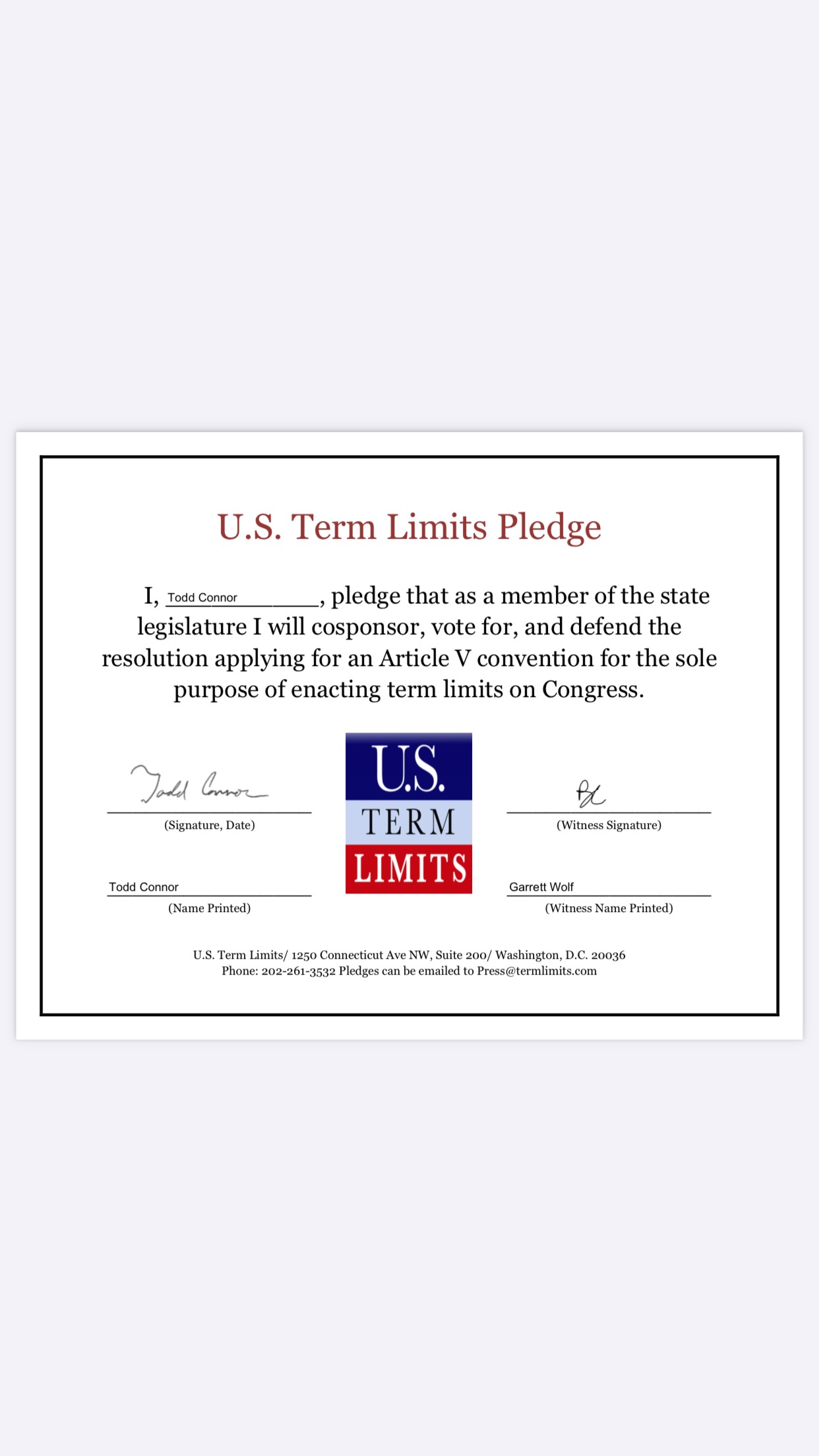 USTL President, Philip Blumel, commented on Connor’s pledge saying, Todd’s support of term limits shows that there are individuals who are willing to listen to the majority of voters who want term limits. America needs a Congress that will be served by citizen legislators, not career politicians.”