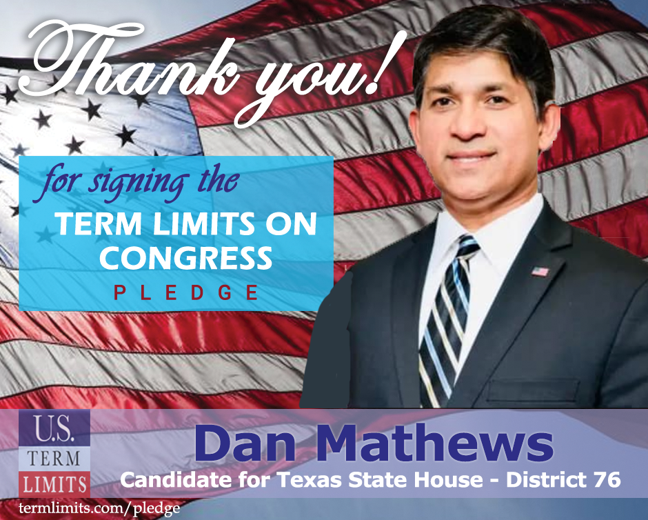 The U.S. Term Limits pledge is provided to candidates and members of state legislatures. It reads, “I pledge that, as a member of the state legislature, I will cosponsor, vote for, and defend the resolution applying for an Article V convention for the limited purpose of enacting term limits on Congress.”