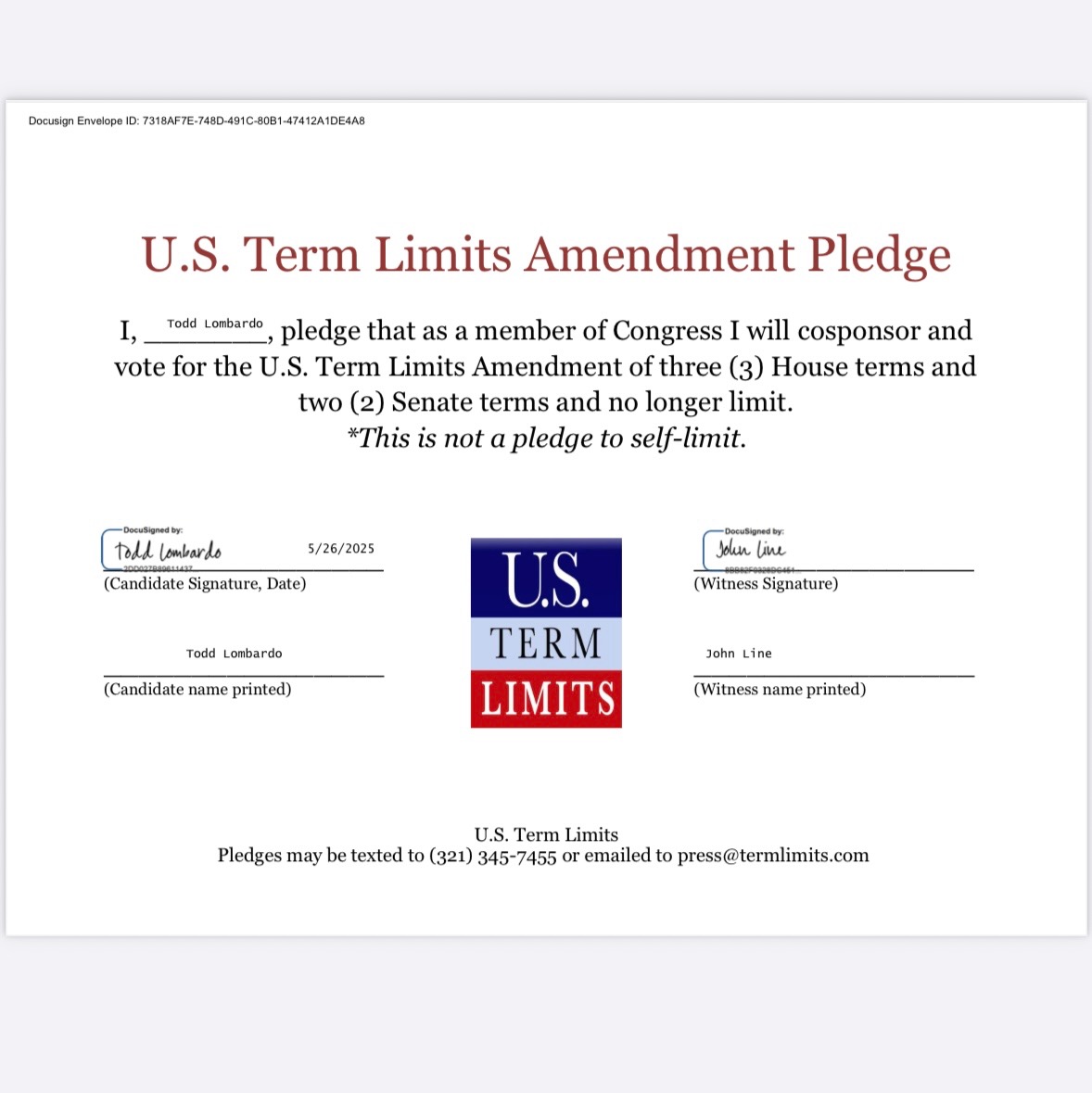 Washington D.C. – U.S. Term Limits (USTL), the leader in the non-partisan national movement to limit terms for elected officials, praises 2026 U.S. House candidate for California, Todd Lombardo (district 37), for signing the pledge for an amendment to term limit Congress. Lombardo is the first signer in this race.