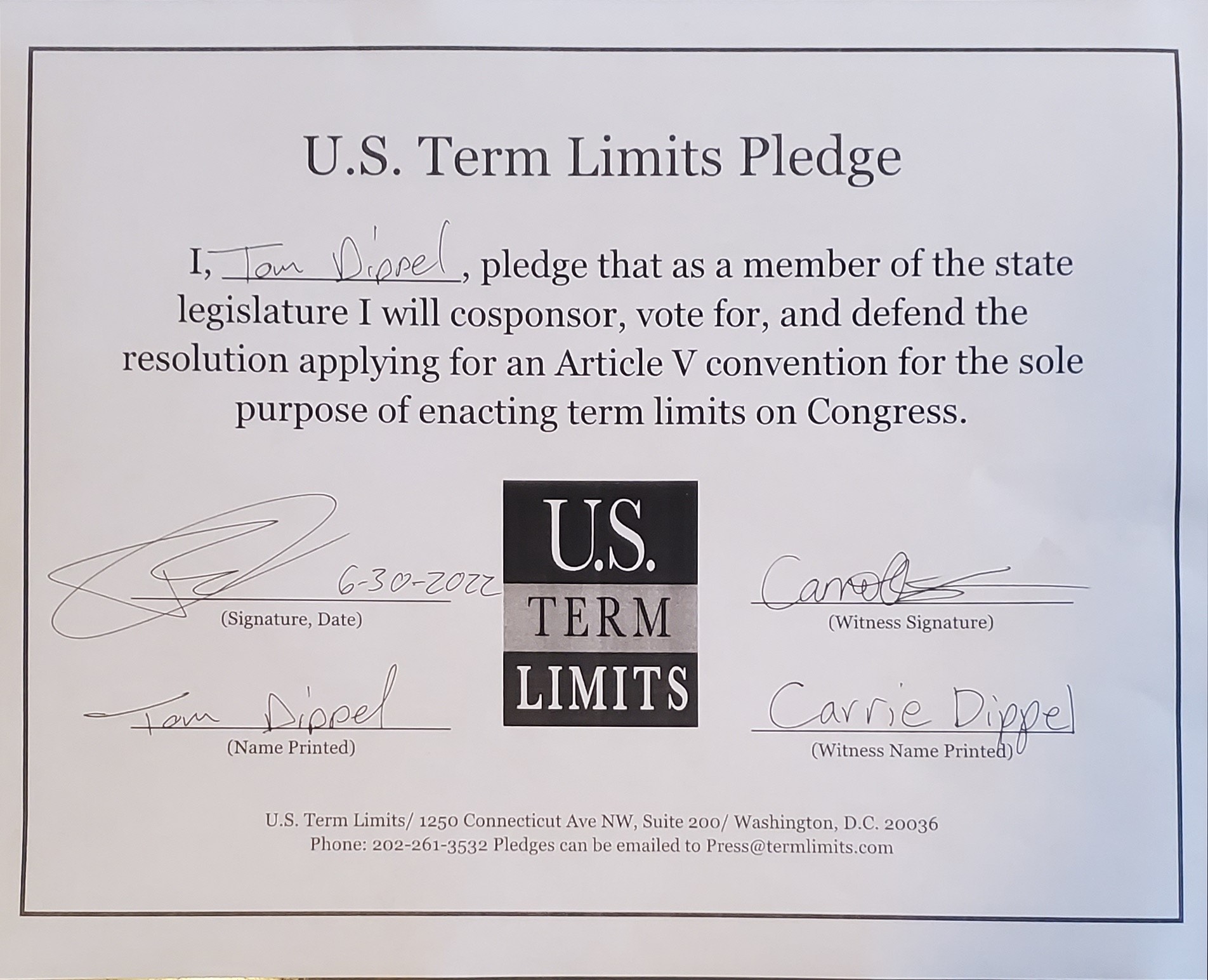 Minneapolis, MN – U.S. Term Limits (USTL), the leader in the national, non-partisan movement to limit terms for elected officials, is gathering support from state lawmakers across the nation. Its mission is to get 34 states to apply for an amendment proposal convention specific to term limits on Congress. Minnesota state senate candidate, Tom Dippel (district 41) has committed support for term limits on Congress by signing the Term Limits Convention pledge. Dippel is the first signer in this race.