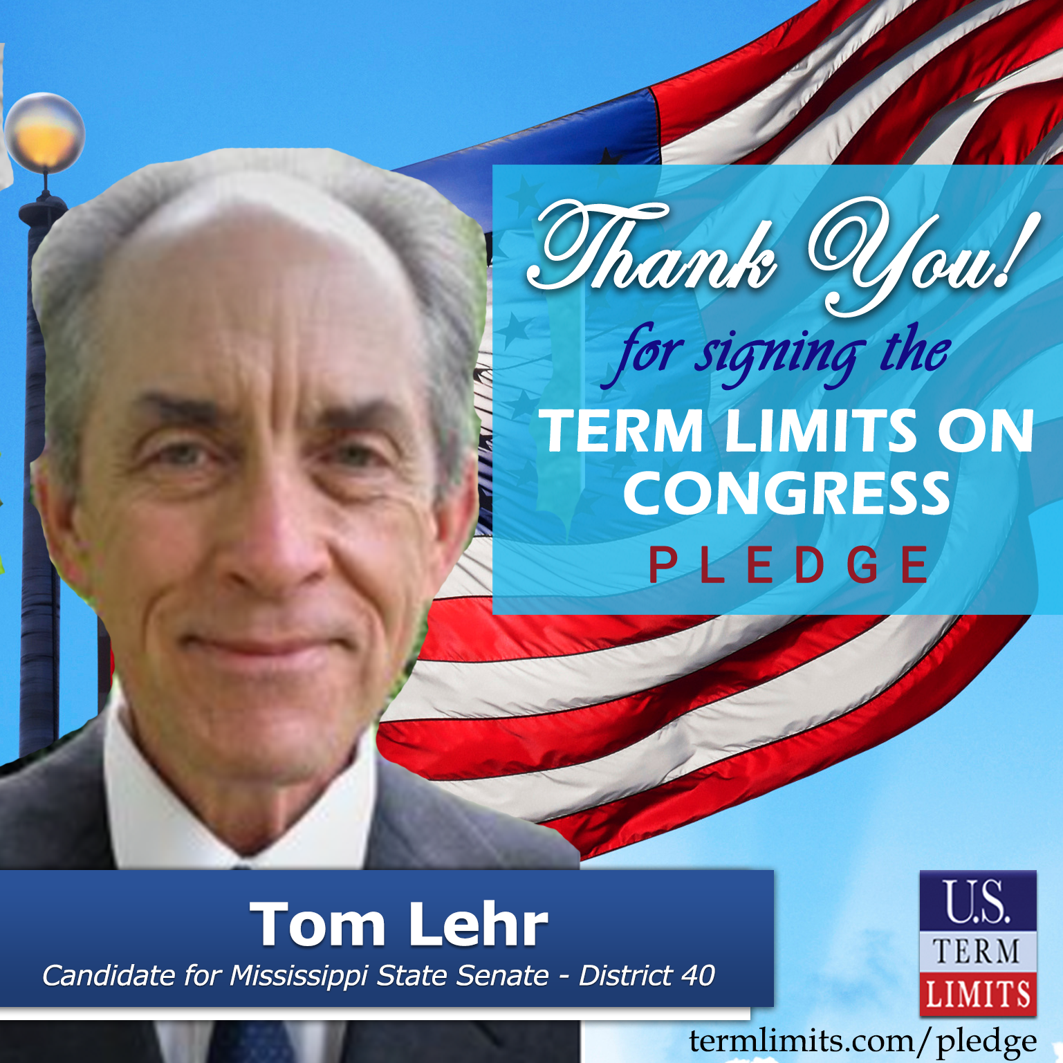 Picayune, MS – U.S. Term Limits (USTL), the leader in the national, non-partisan movement to limit terms for elected officials, is gathering support from state lawmakers across the nation. Its mission is to get 34 states to apply for an amendment proposal convention specific to term limits on Congress. Mississippi state senate candidate, Tom Lehr (District 40), has committed support for term limits on Congress by signing the Term Limits Convention pledge.
